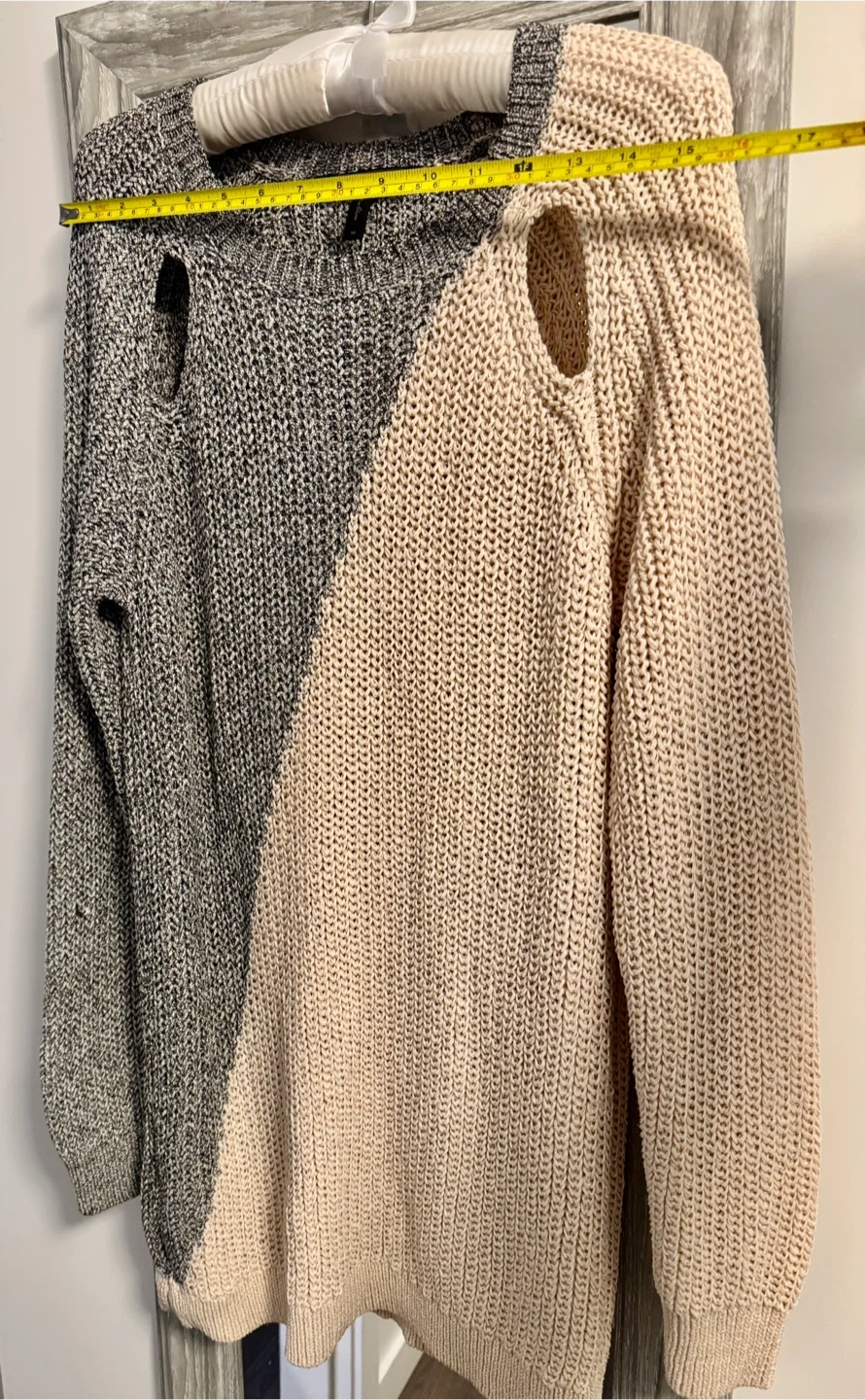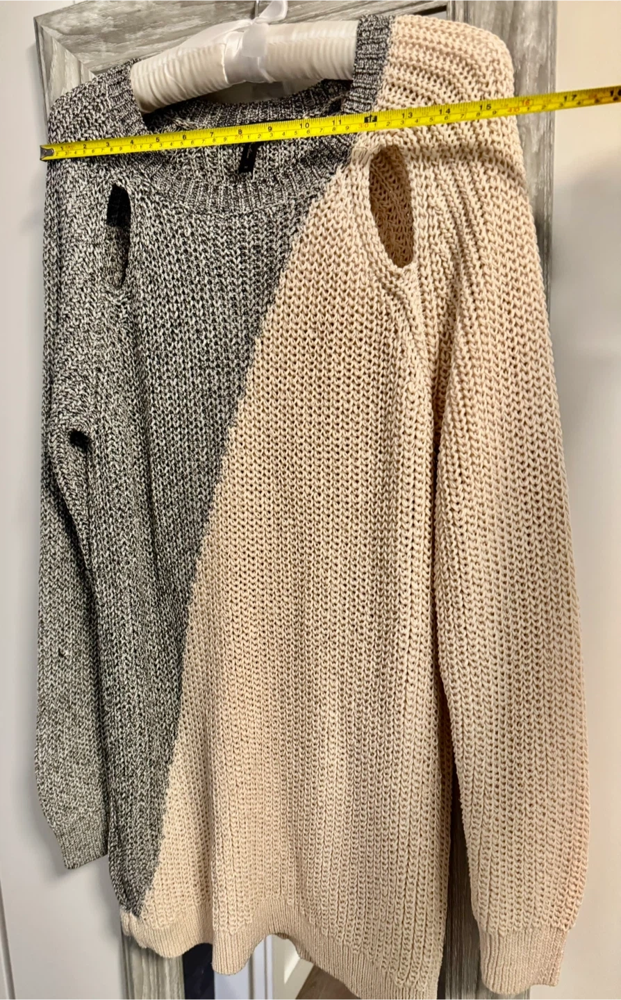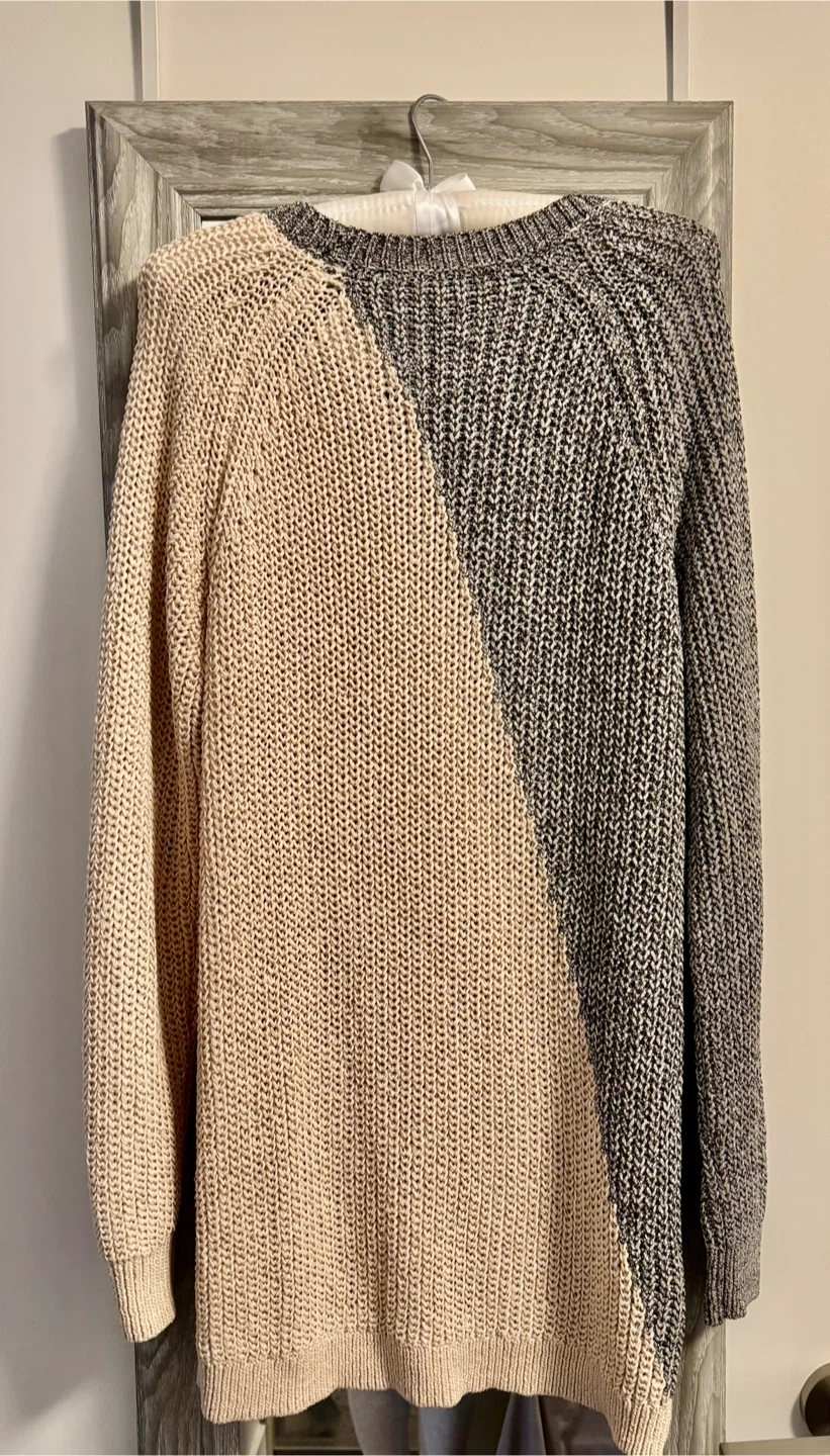 Selling a BCBGMAXAZRIA colour block knit sweater in size medium. It's a unique piece with a stylish design! The sweater features a blend of polyester and cotton, making it both comfortable and durable. Perfect for adding a touch of modern flair to your wardrobe.