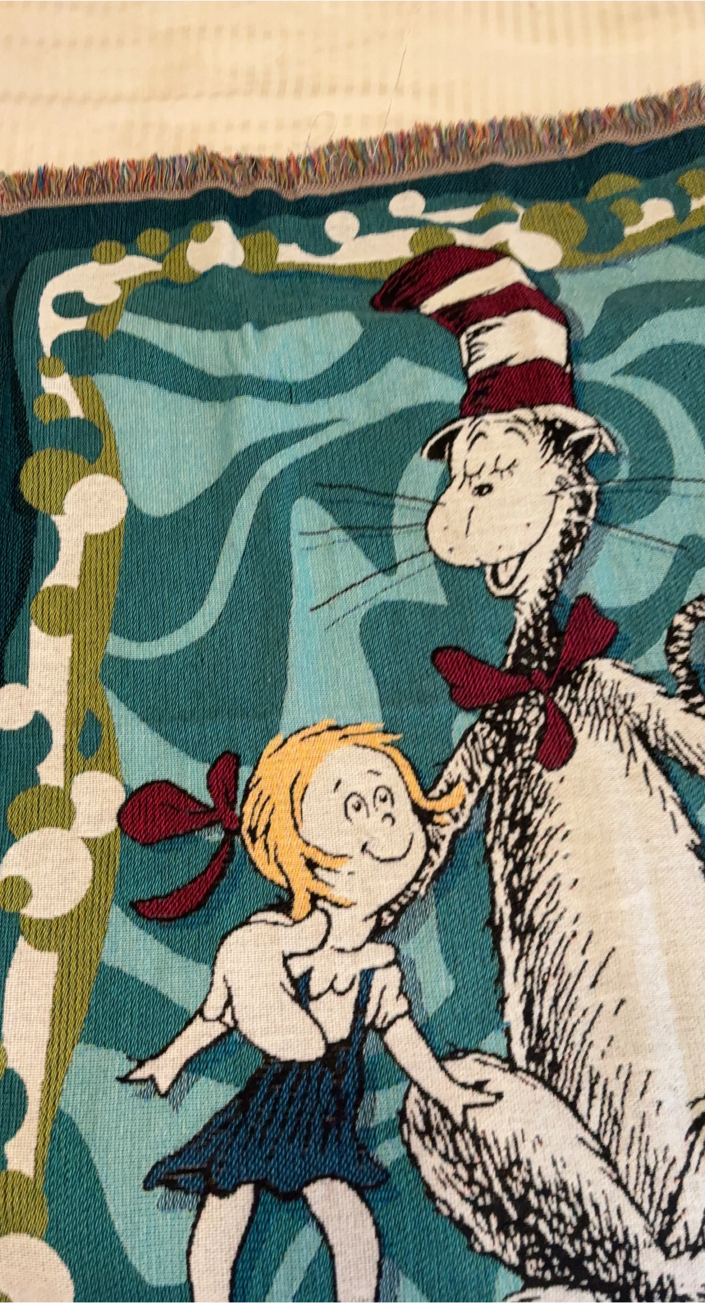 Features the classic Cat in the Hat characters, Thing 1 and Thing 2. Made from a woven material with a fringed edge. It's a cozy and decorative piece for any fan!