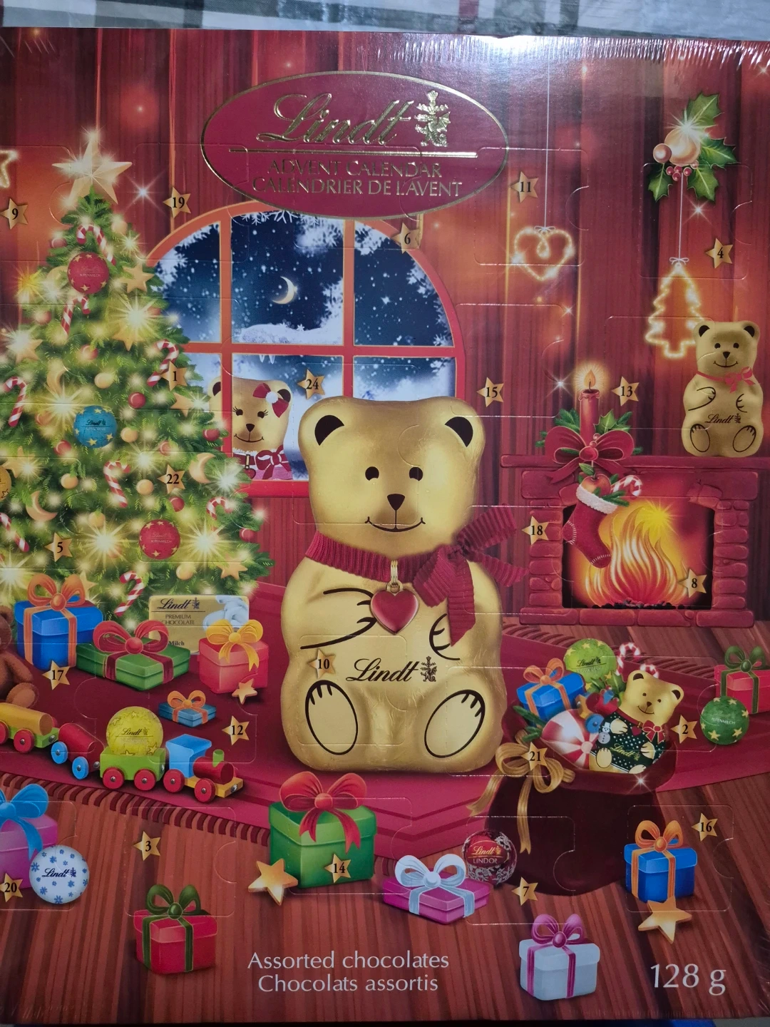 This is a Lindt advent calendar with assorted chocolates. It contains 128g of chocolates. It's perfect for counting down to Christmas!
