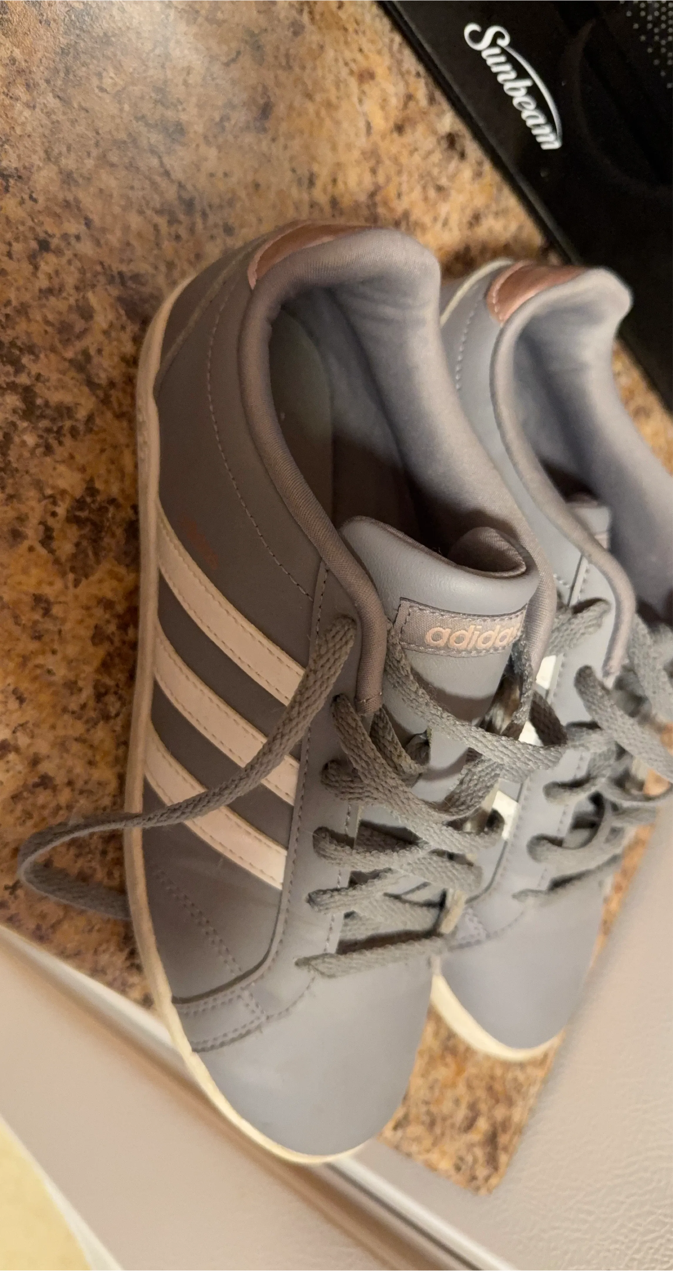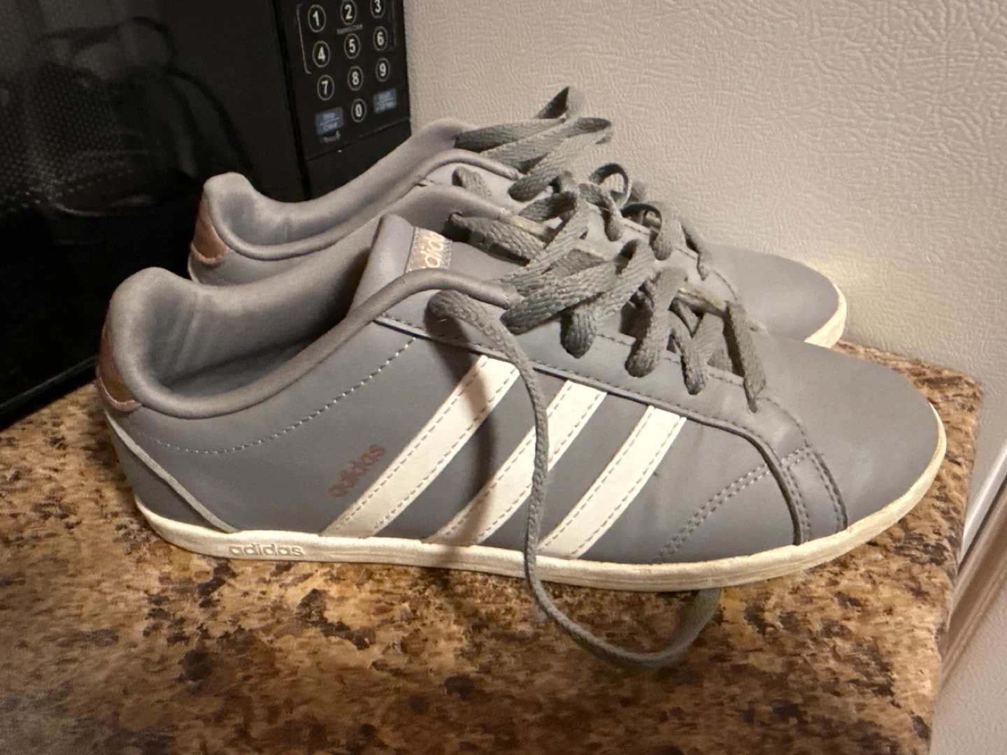 These Adidas sneakers are a lovely light grey with white stripes. They feature a rose gold accent on the heel tab. Great for everyday wear!