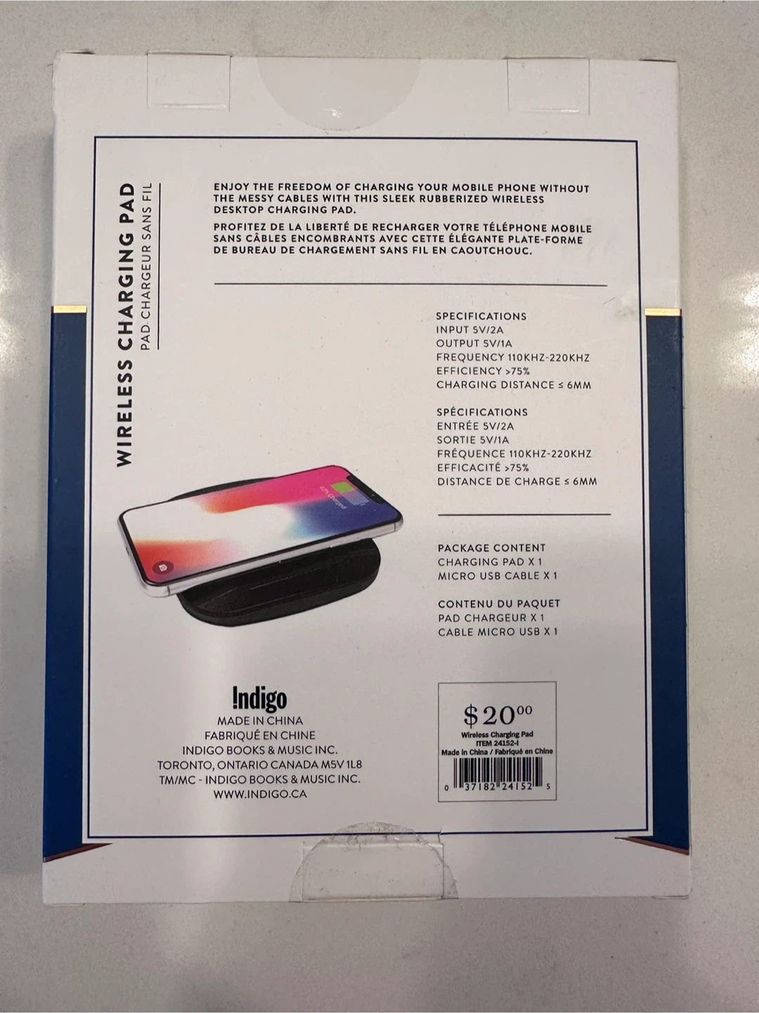 Charge your mobile phone without messy cables using this sleek, rubberized wireless charging pad. It's Qi enabled and comes with a micro USB cable. Output is 5V/2A with efficiency over 75%.