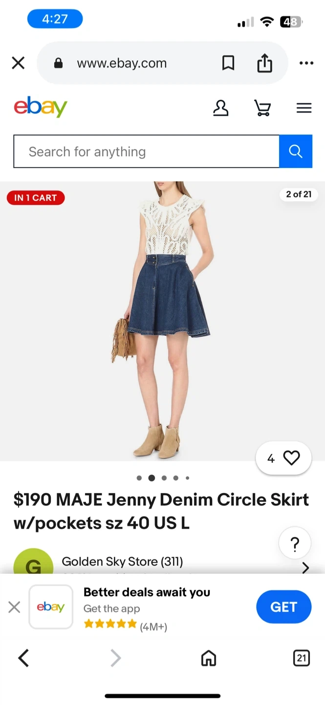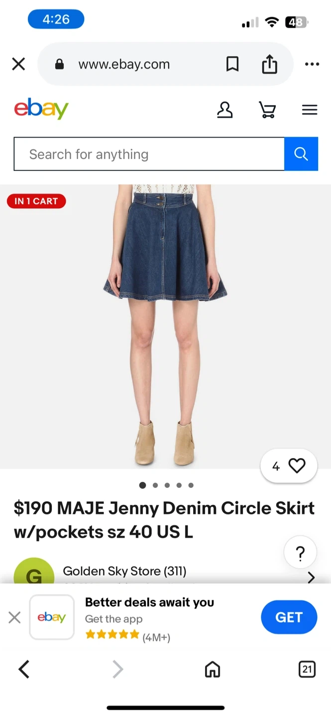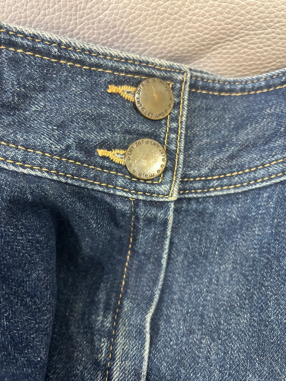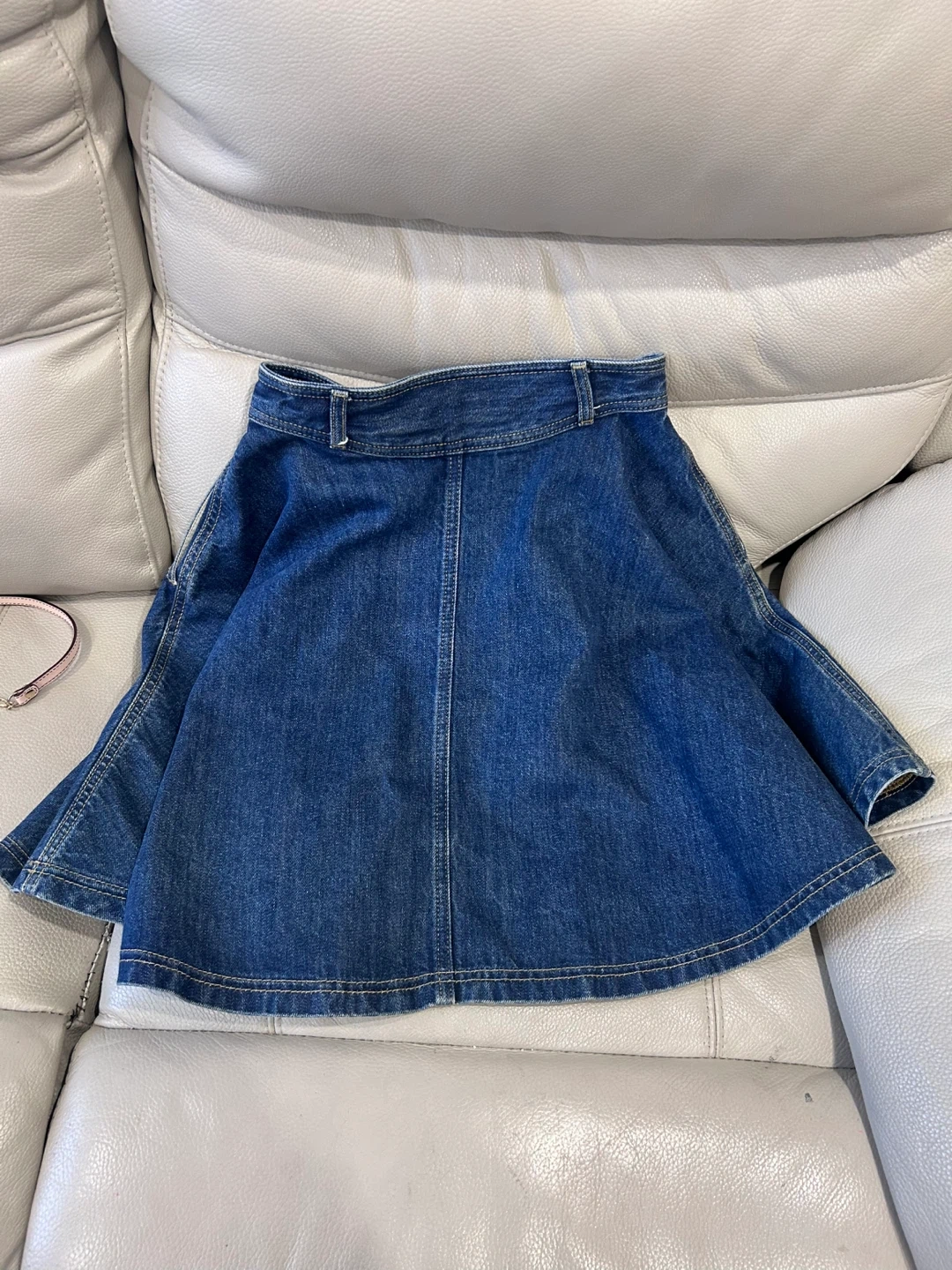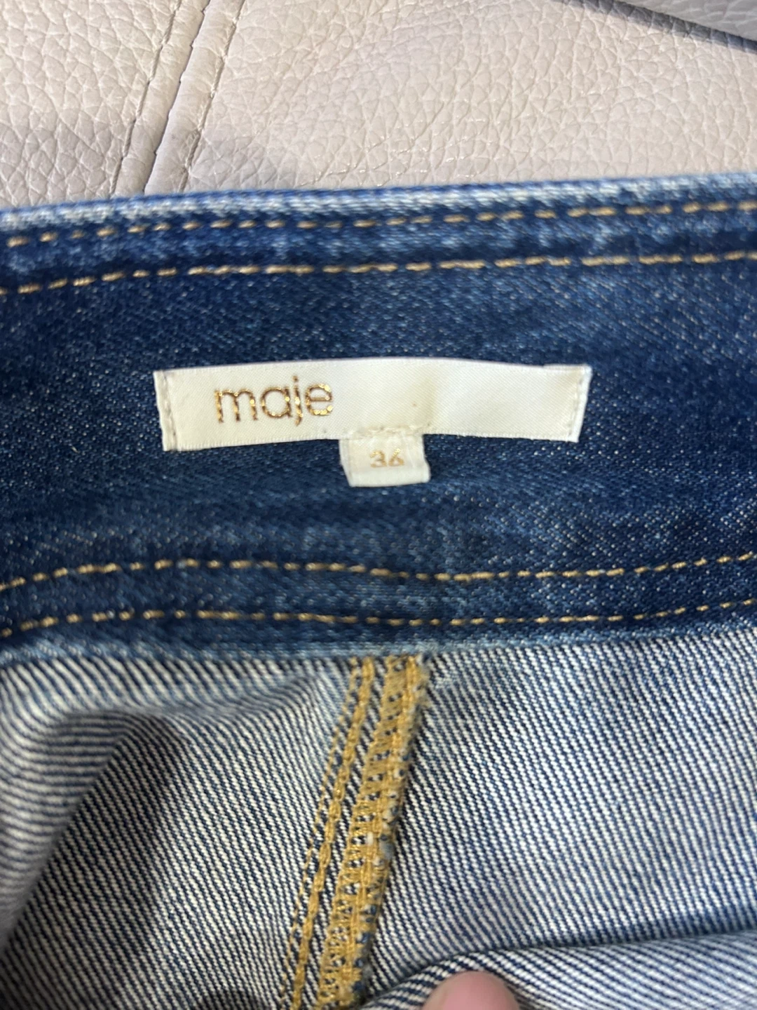 Selling a Maje denim mini skirt in size 36. It's in great condition and ready for a new owner! The skirt is a classic denim blue and features a flattering A-line shape. Perfect for casual outings or dressing up with a cute top