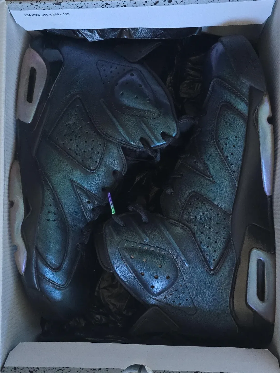 These Air Jordan 6 Retro shoes come in a sleek black colorway. They're made of premium leather with perforations for breathability. Includes original box and packaging.