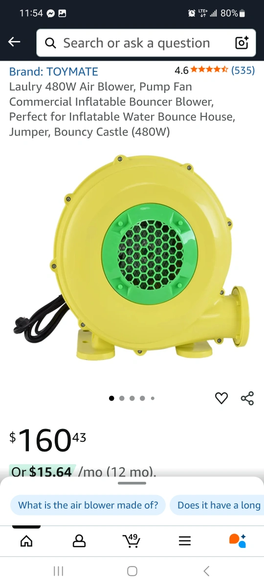 Selling a TOYMATE Laulry 480W air blower! Perfect for bouncy castles and inflatable water bounce houses. It's a commercial inflatable blower and pump fan with 480W power. Originally bought for $160.43