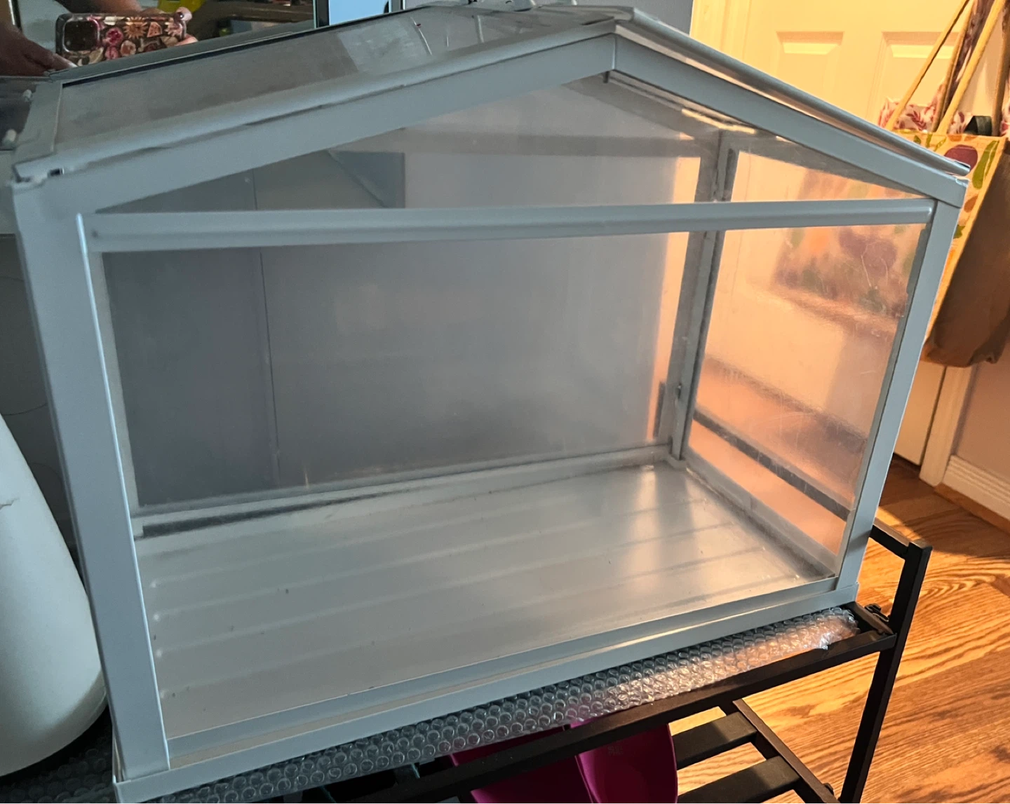 A small greenhouse with a white metal frame and clear panels. It's perfect for starting seedlings or growing small plants indoors. Hinged lid for easy access.