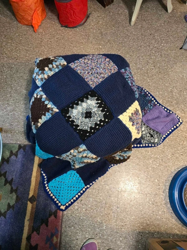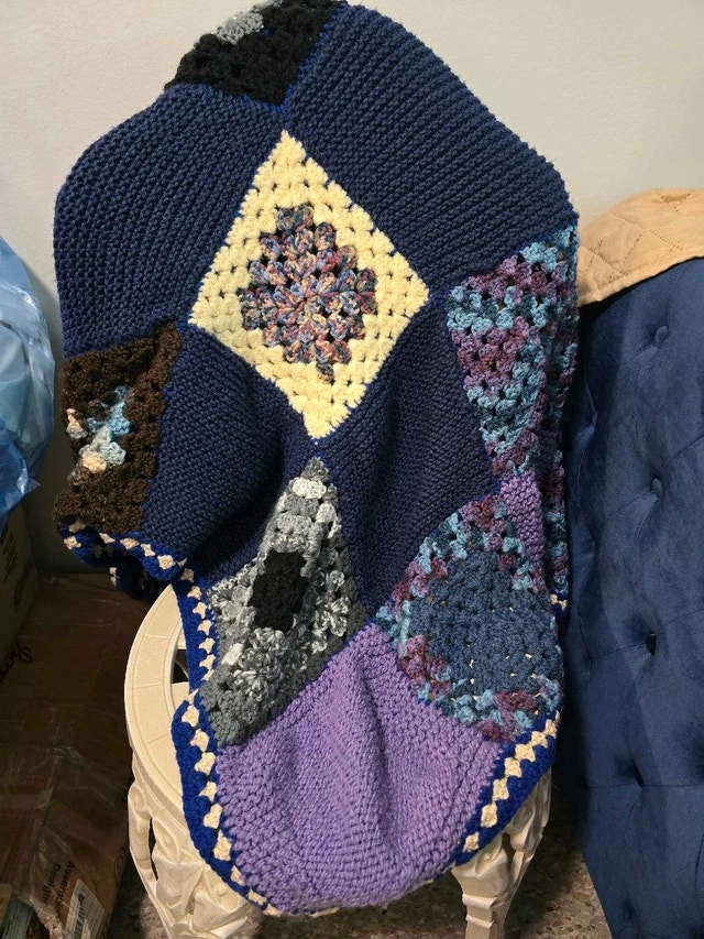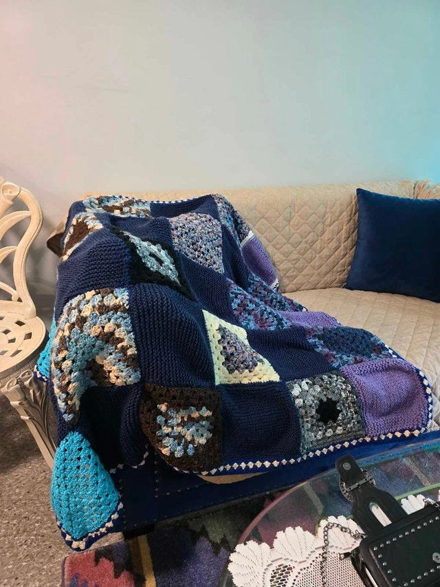 Barely used, hand-crafted crochet Afghan in beautiful blues and purple shades with a quilt design. Some yarn has a shimmer. Size 54 inches by 40 inches. Pickup area Grantham Ave and Carlton St. From a clean, smoke-free home. Please see my other ads, thank you.