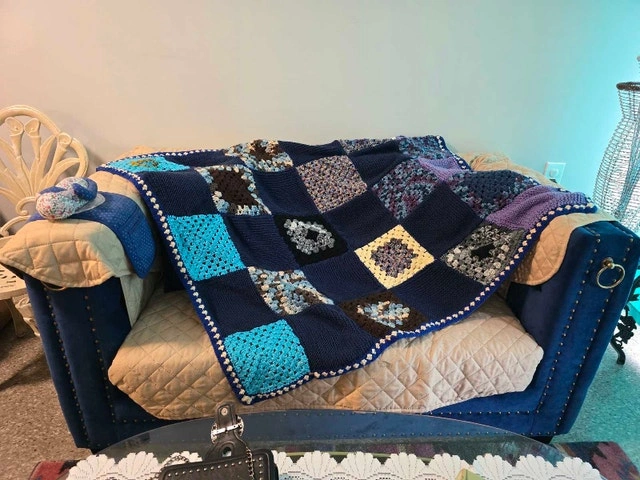 Barely used, hand-crafted crochet Afghan in beautiful blues and purple shades with a quilt design. Some yarn has a shimmer. Size 54 inches by 40 inches. Pickup area Grantham Ave and Carlton St. From a clean, smoke-free home. Please see my other ads, thank you.