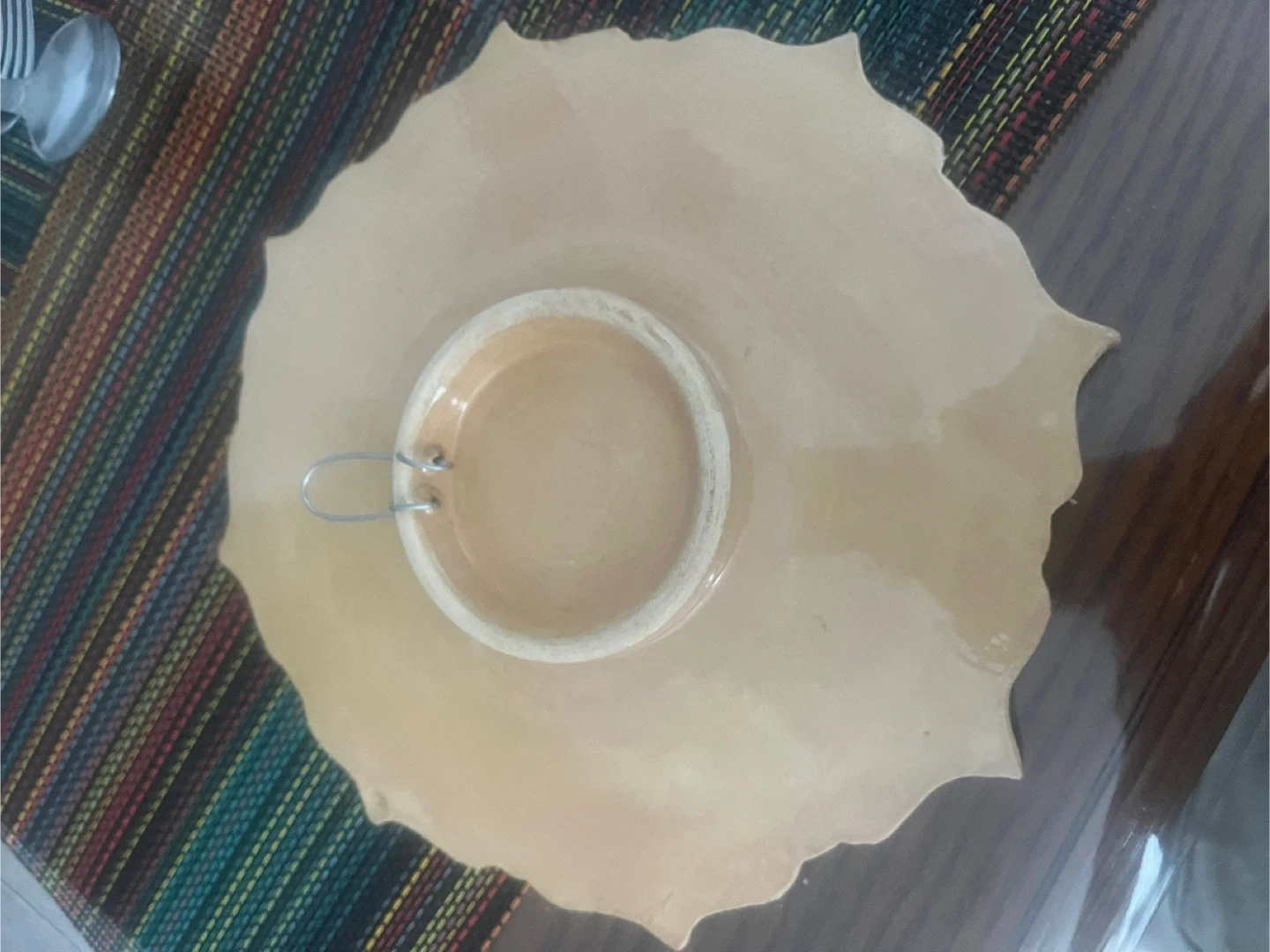 Hand-painted ceramic serving platter with a vibrant floral design. It features a central dip bowl and a unique scalloped edge. This piece adds a colourful touch to any table setting!