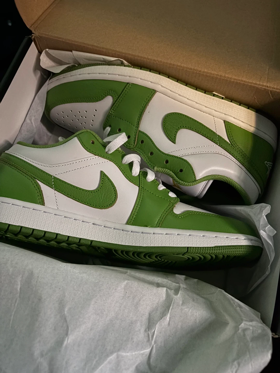 Selling a pair of Nike Air Jordan 1 Low sneakers in a vibrant green color! They come with the original box. Perfect for adding a pop of color to your wardrobe