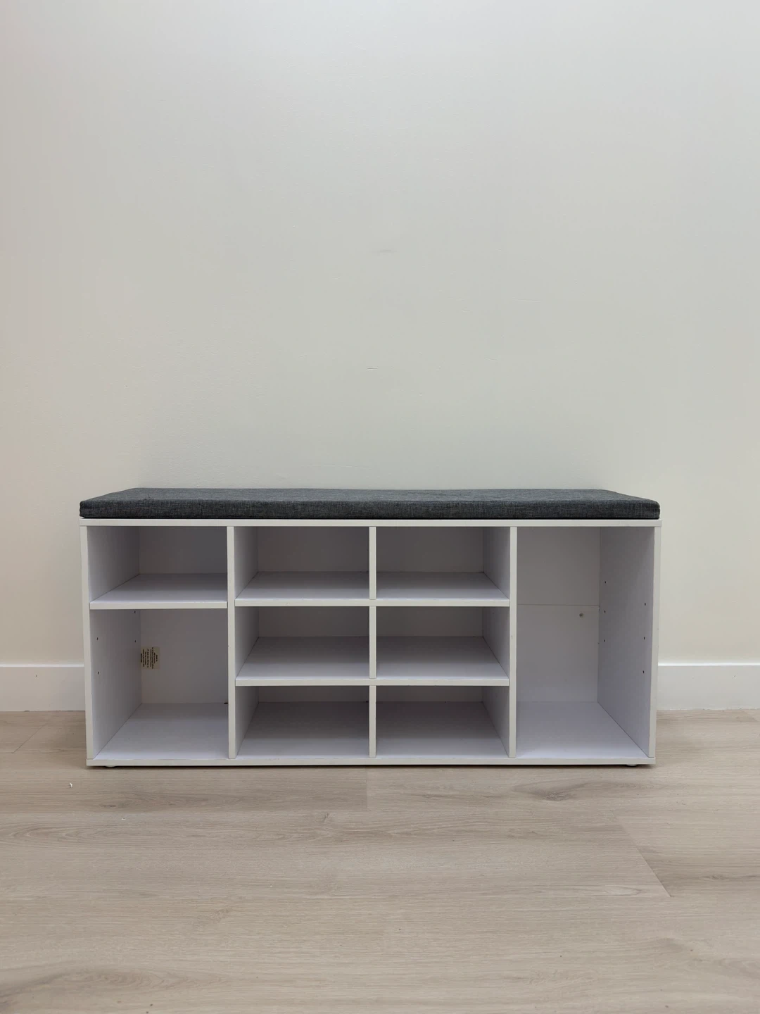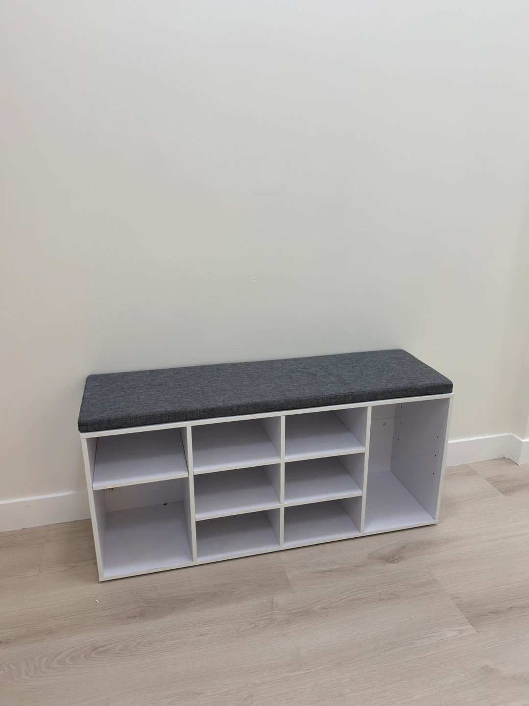 This is a white shoe bench with a comfy grey cushion on top! It has multiple compartments for storing shoes or other items. The dimensions are approximately 104 cm in length, 30 cm in depth, and 48 cm in height. Perfect for keeping your entryway organized!