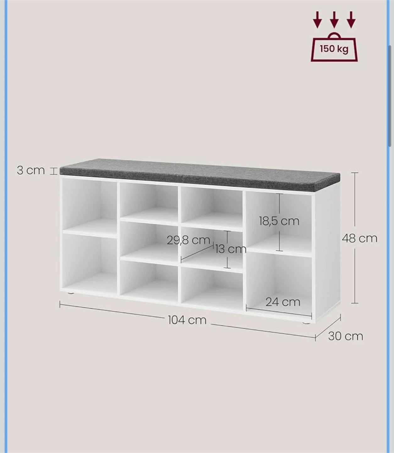This is a white shoe bench with a comfy grey cushion on top! It has multiple compartments for storing shoes or other items. The dimensions are approximately 104 cm in length, 30 cm in depth, and 48 cm in height. Perfect for keeping your entryway organized!