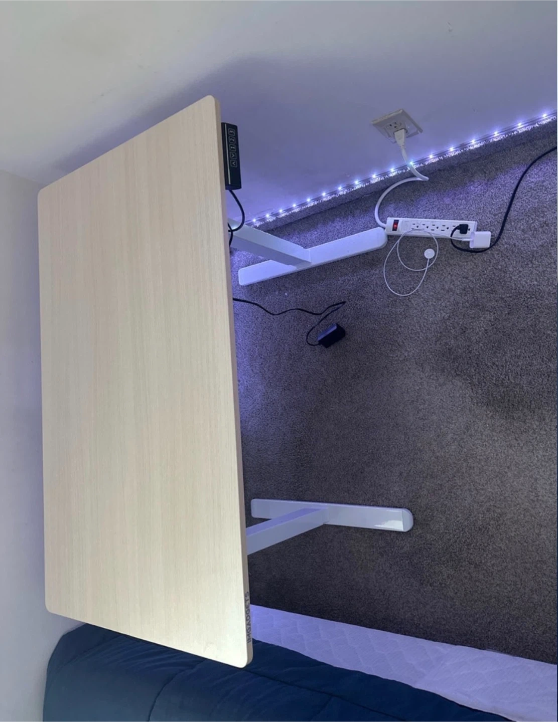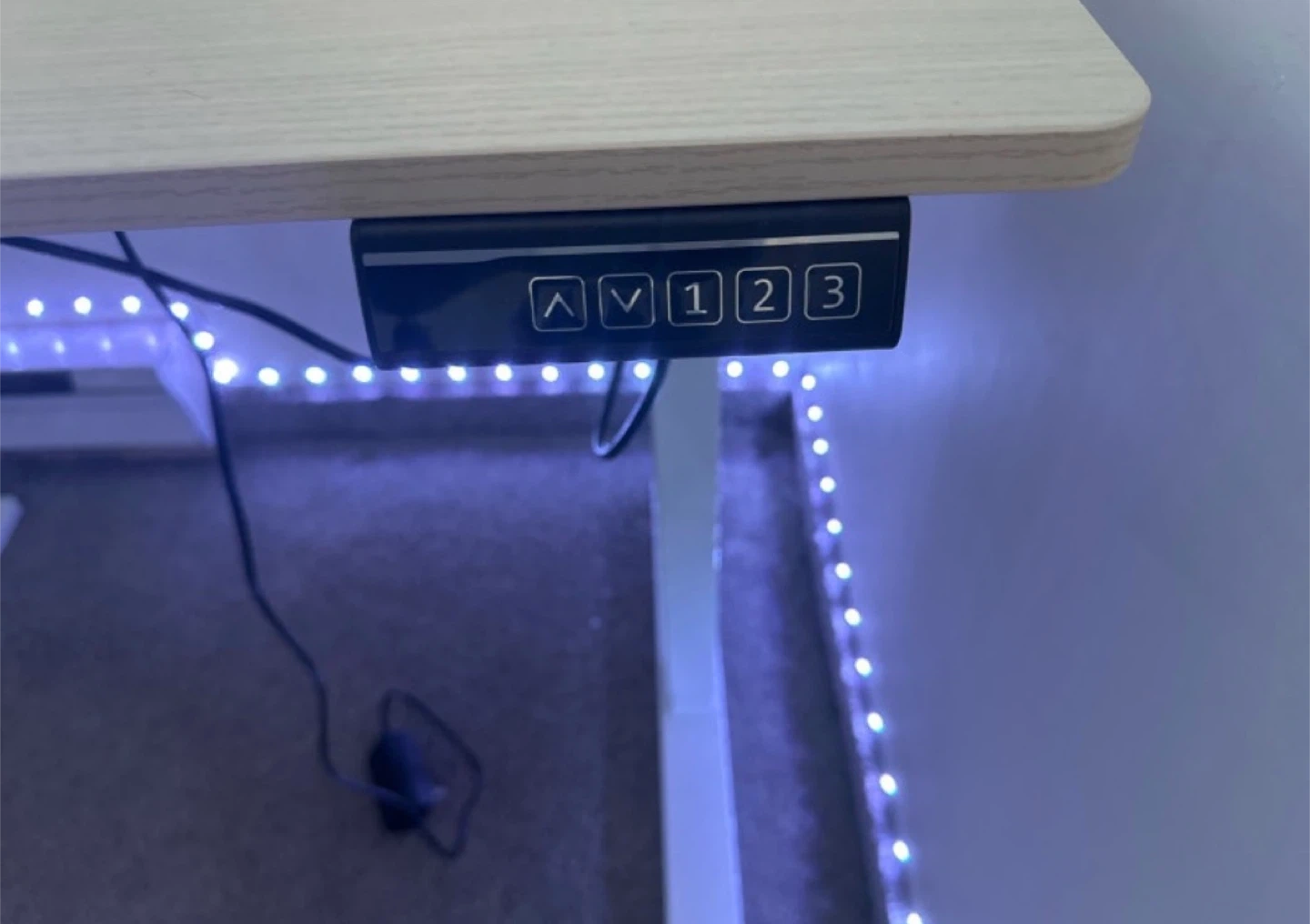 This is an adjustable standing desk with a light wood finish. It has a control panel with preset memory functions. The desk frame is white and has an electric motor for height adjustment.