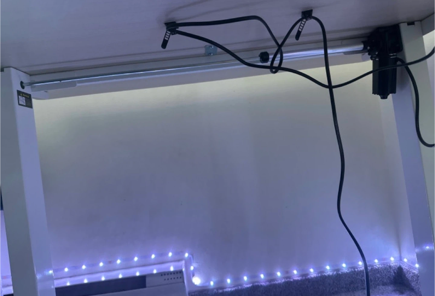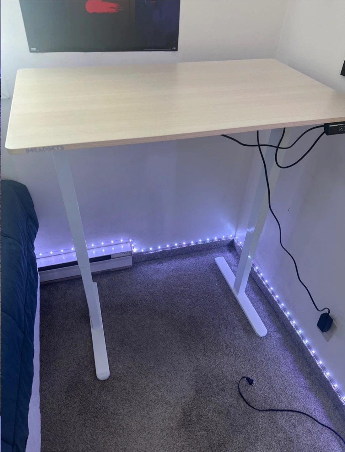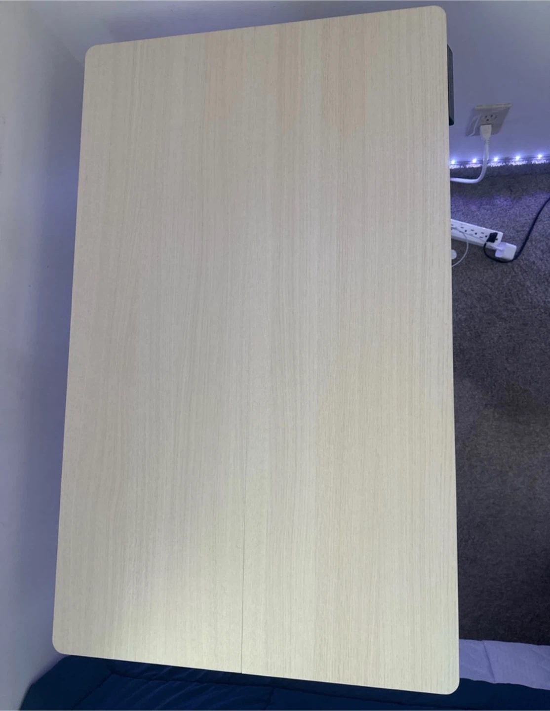 This is an adjustable standing desk with a light wood finish. It has a control panel with preset memory functions. The desk frame is white and has an electric motor for height adjustment.