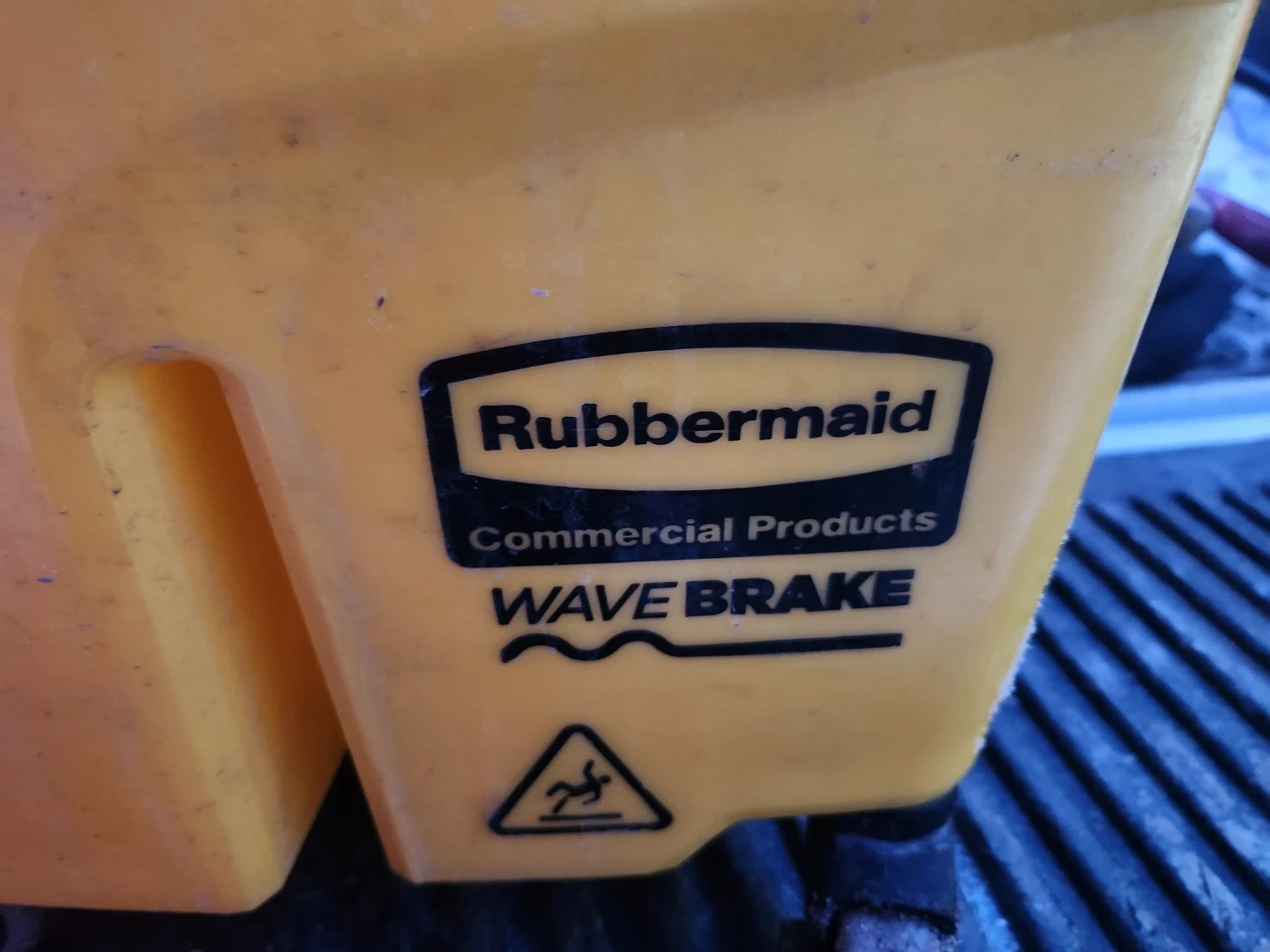 This is a yellow Rubbermaid Commercial Wave Brake mop bucket with wringer. It's made of durable plastic and includes a mop handle holder. Great for commercial cleaning needs!