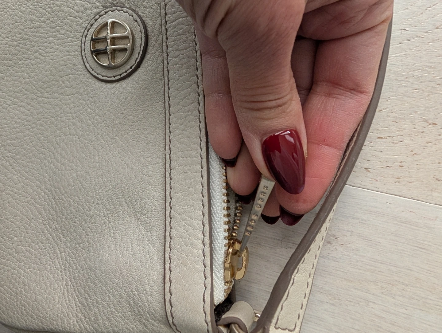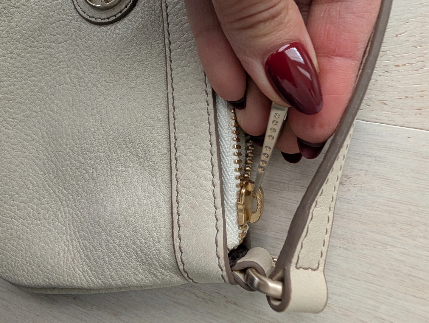 This is a cream leather wristlet clutch by Hugo Boss. It features a zip-top closure with a detachable wrist strap. The interior is lined with fabric and has a zippered pocket inside.