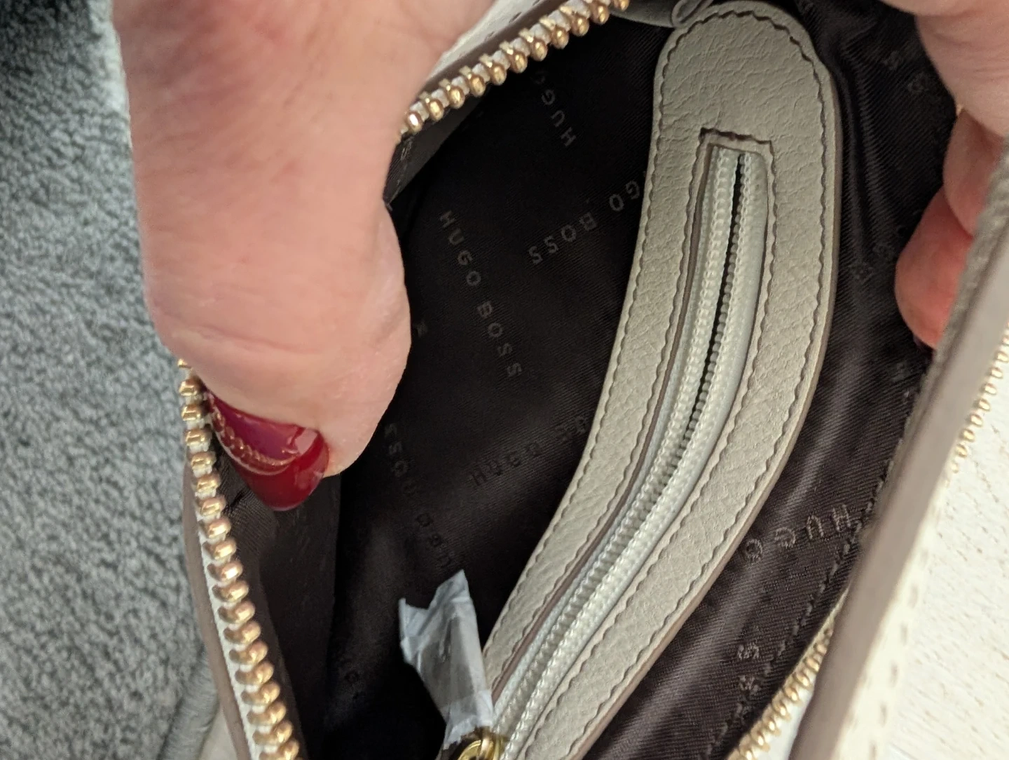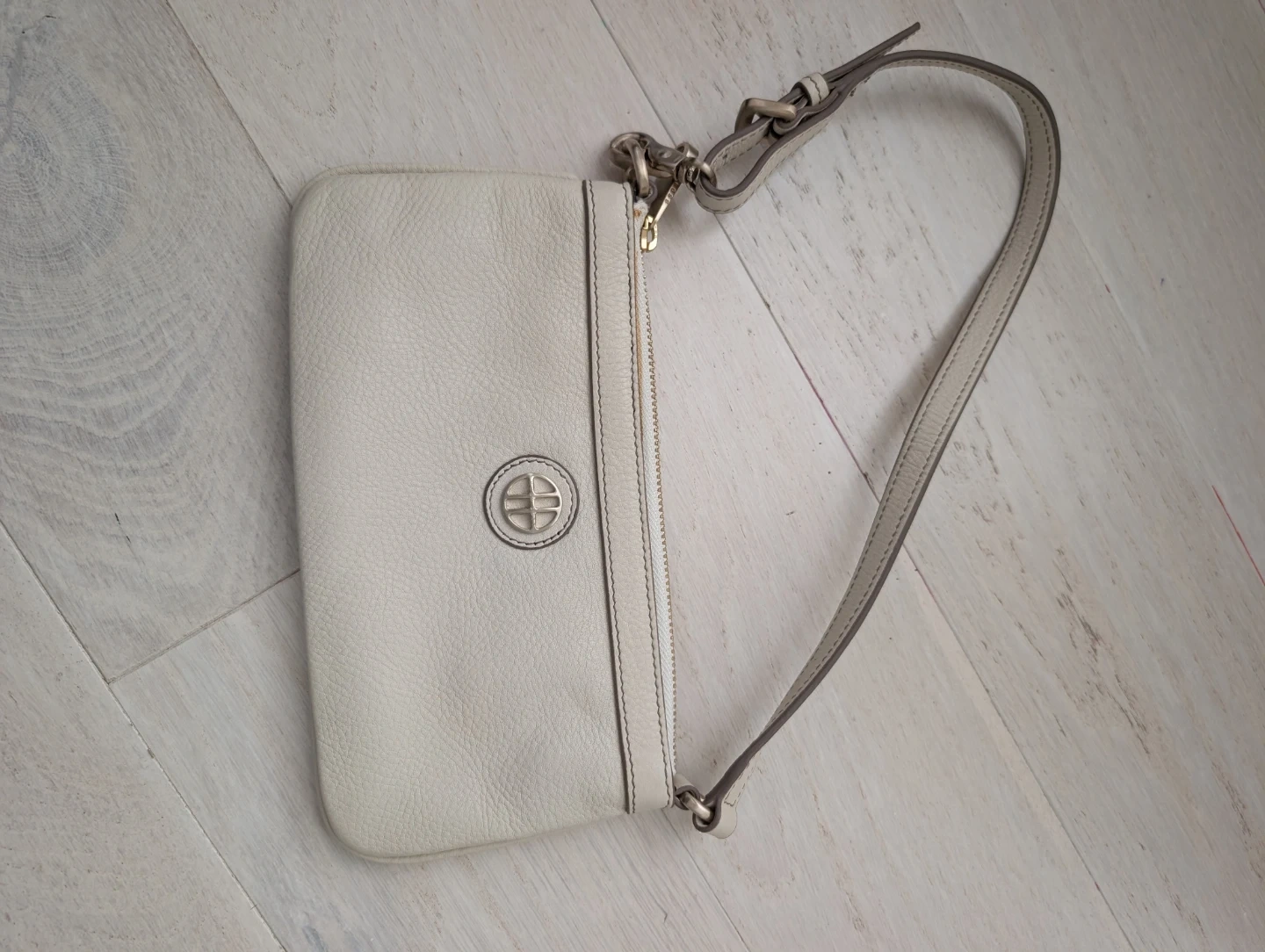 This is a cream leather wristlet clutch by Hugo Boss. It features a zip-top closure with a detachable wrist strap. The interior is lined with fabric and has a zippered pocket inside.
