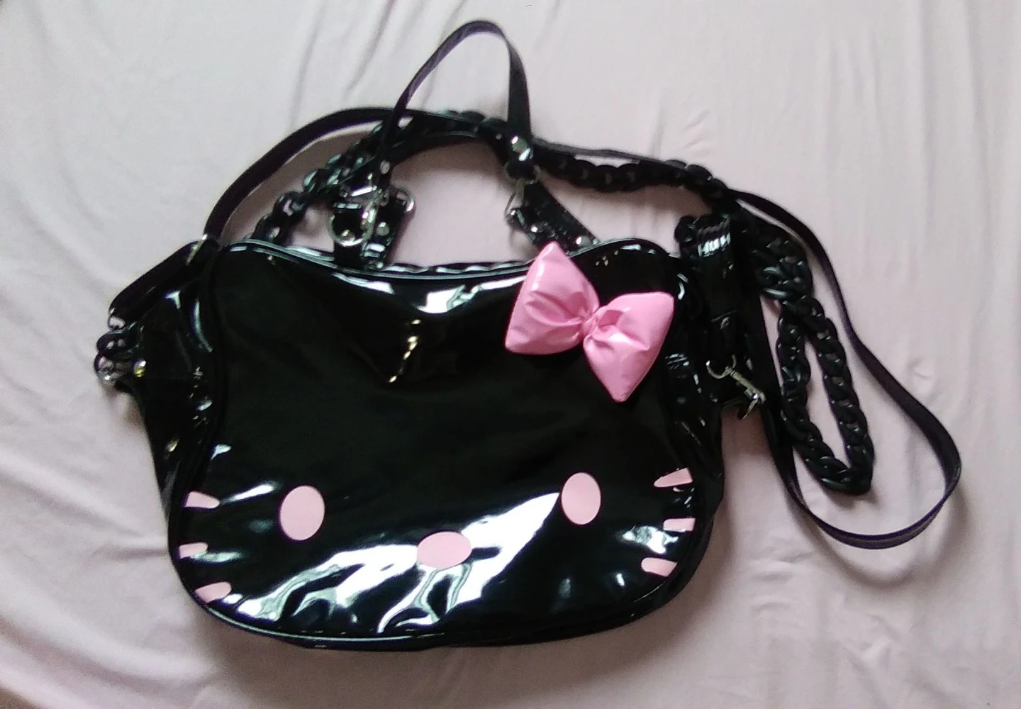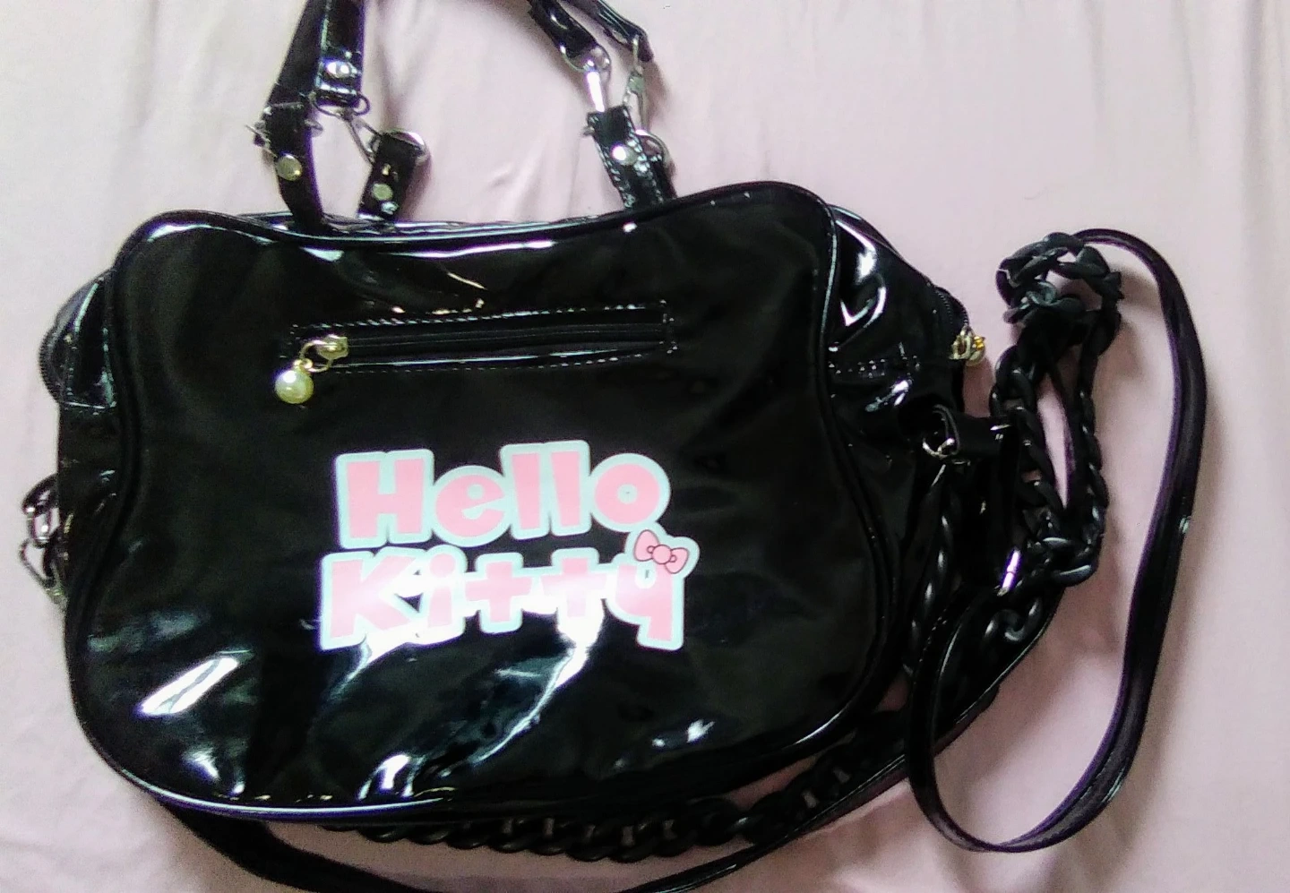 This is a cute black patent Hello Kitty shoulder bag. It features a Hello Kitty face design on the front with a pink bow. The back has Hello Kitty lettering. Includes both short handles and a long adjustable strap