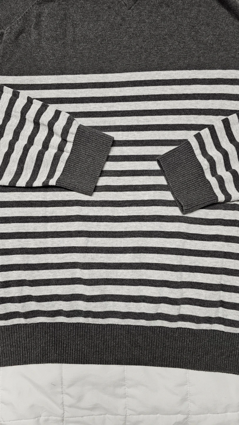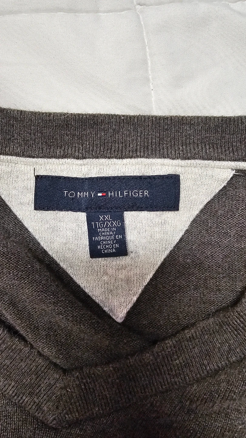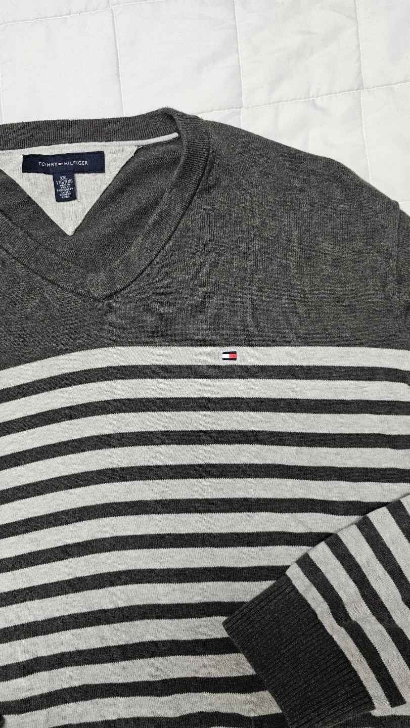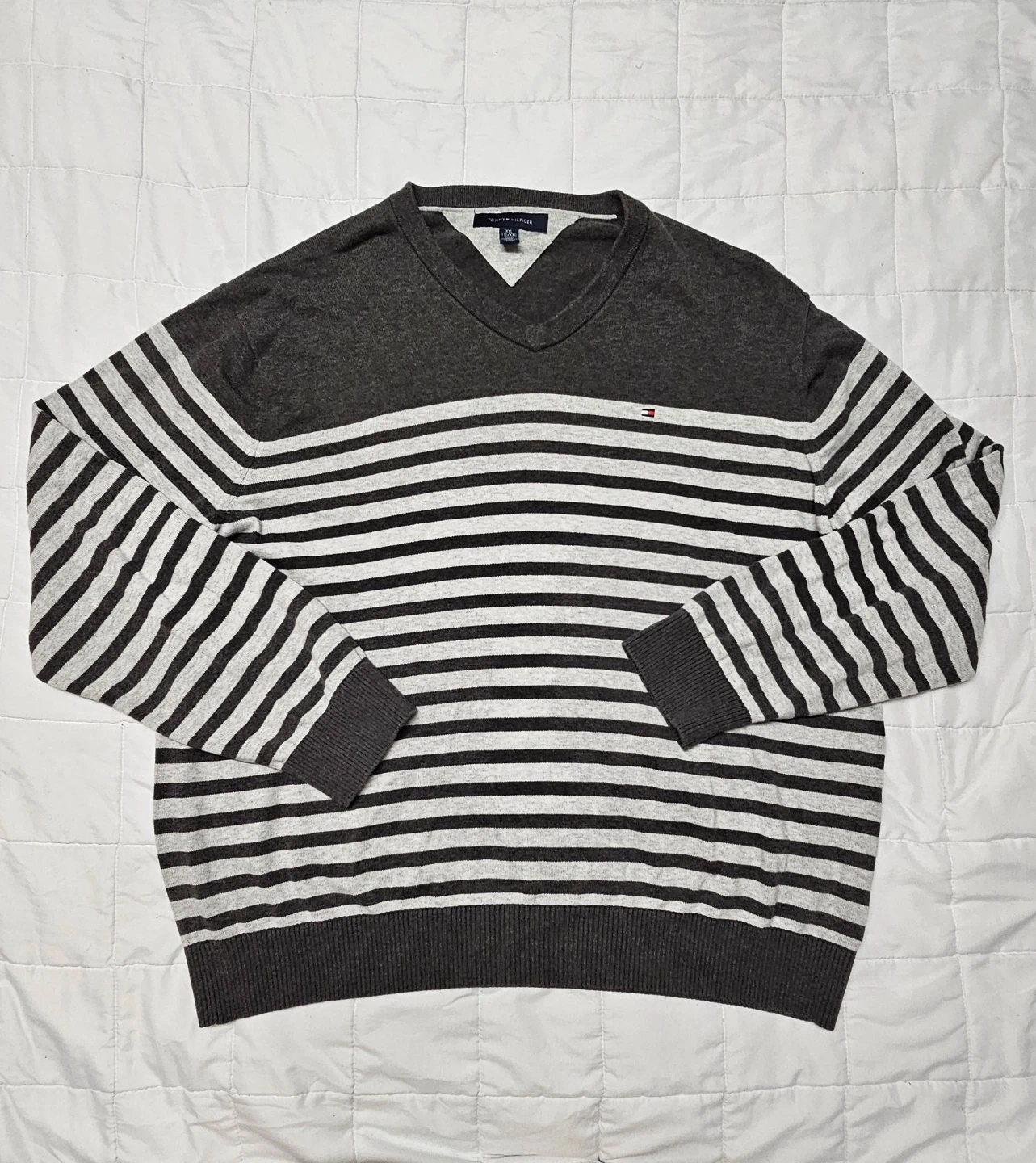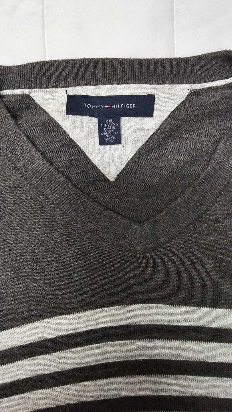 Tommy Hilfiger sweater with a V-neck and horizontal stripes. It's size XXL, made from 100% cotton. Great for layering or wearing on its own!