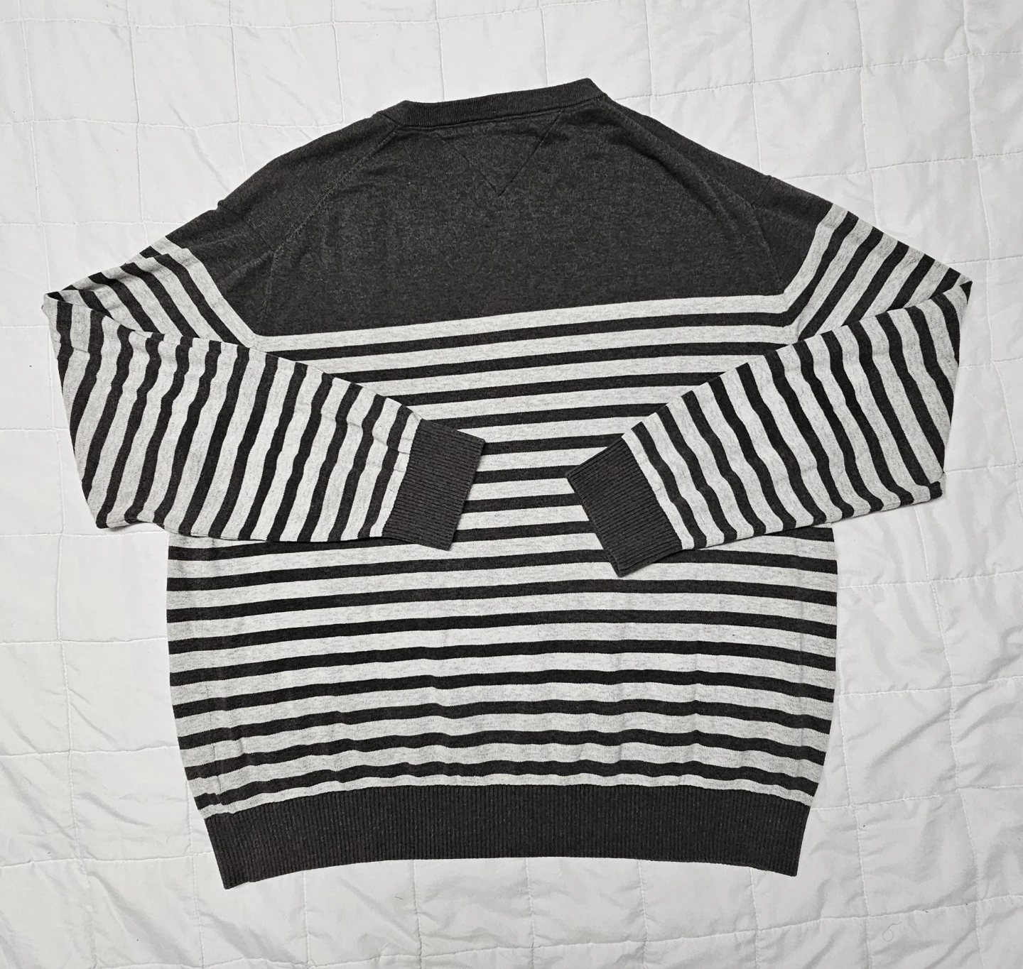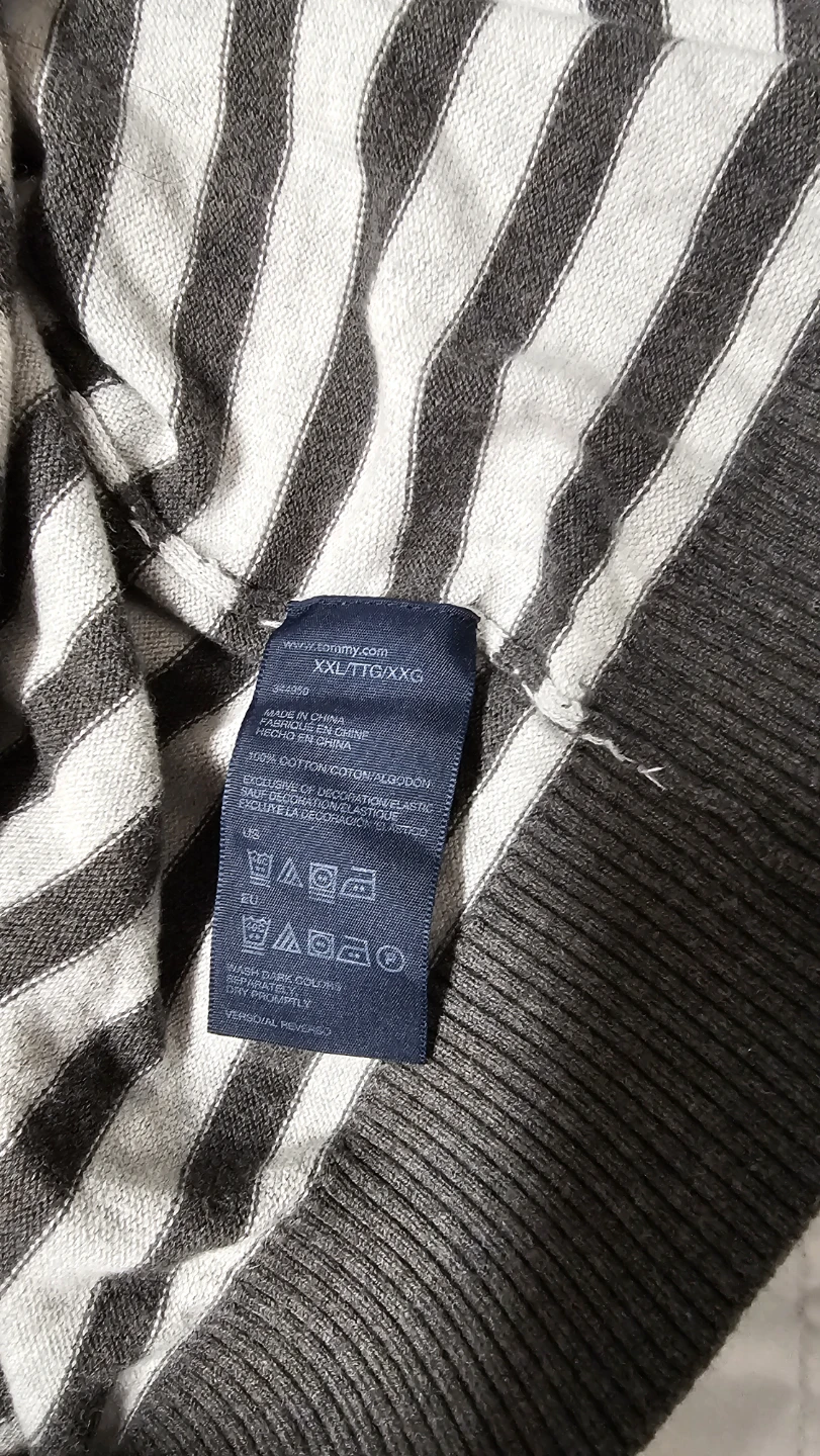 Tommy Hilfiger sweater with a V-neck and horizontal stripes. It's size XXL, made from 100% cotton. Great for layering or wearing on its own!