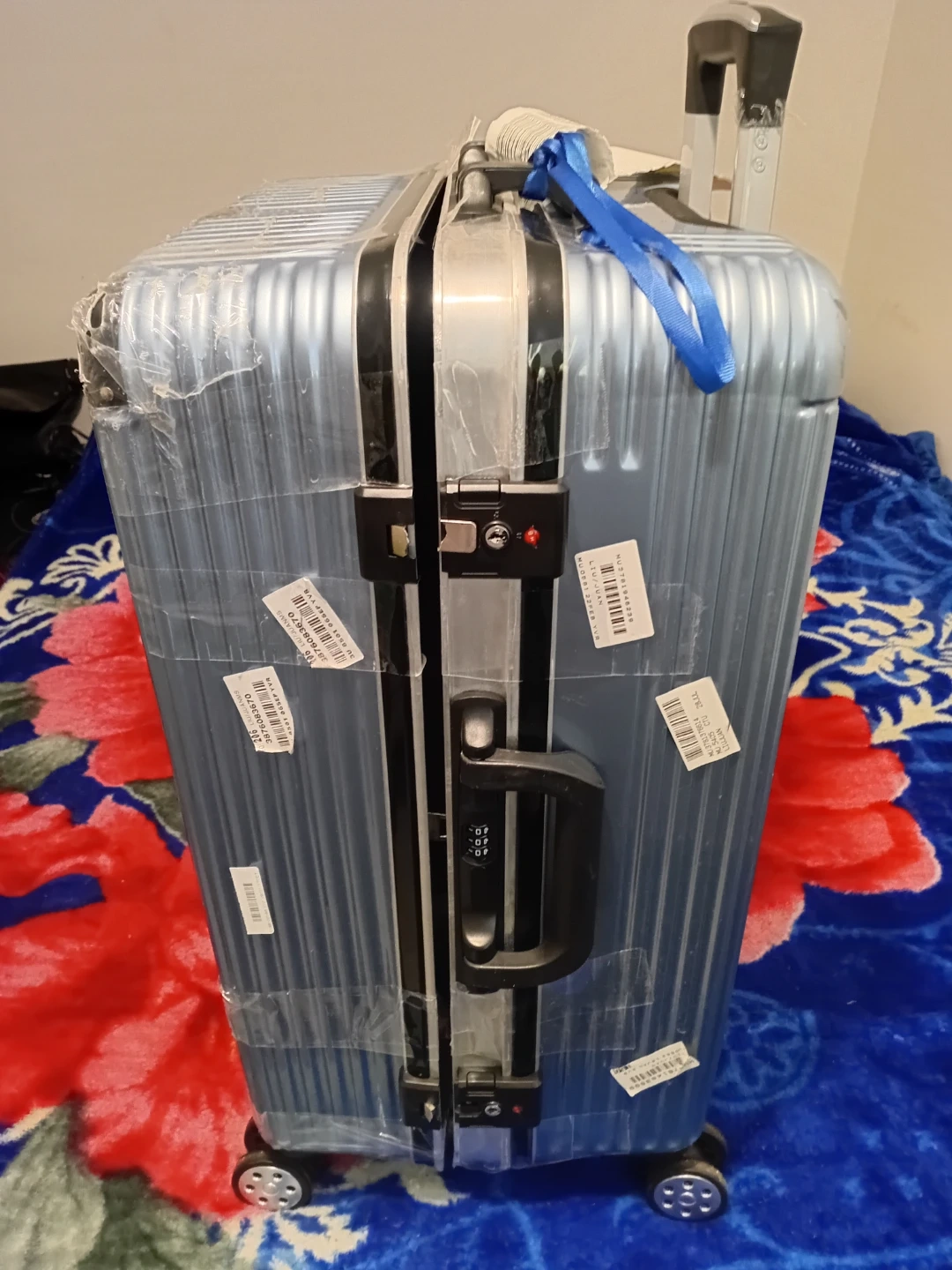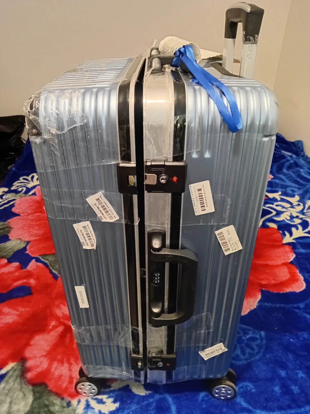 This is a light blue hardside spinner luggage.17 inches legth 24 inches width It's made of a durable material and features four spinner wheels for easy manoeuvring. The telescopic handle is adjustable. It's a great size for weekend trips or as a carry-on.