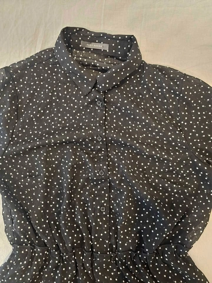 Cute Suzy Shier dress. Black with white polka dots. Long sleeve, button-front shirtdress style. Has elastic waist and tiered skirt. Fabric is sheer and flowy. Great for casual or dressing up.