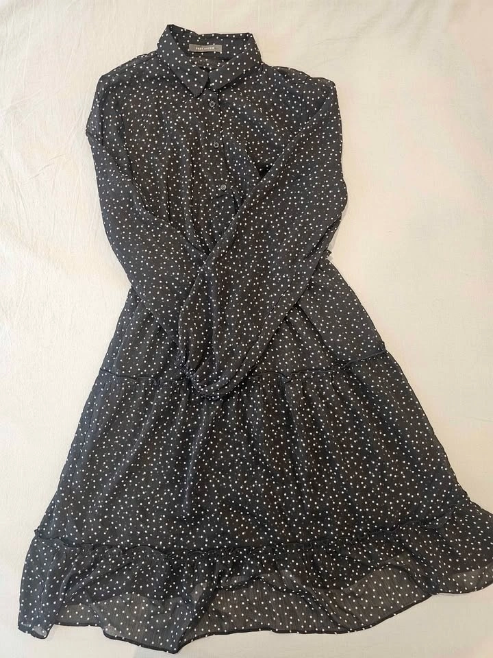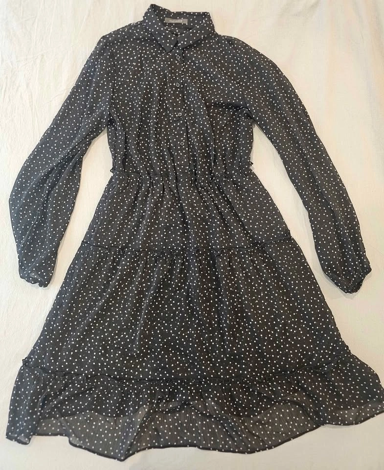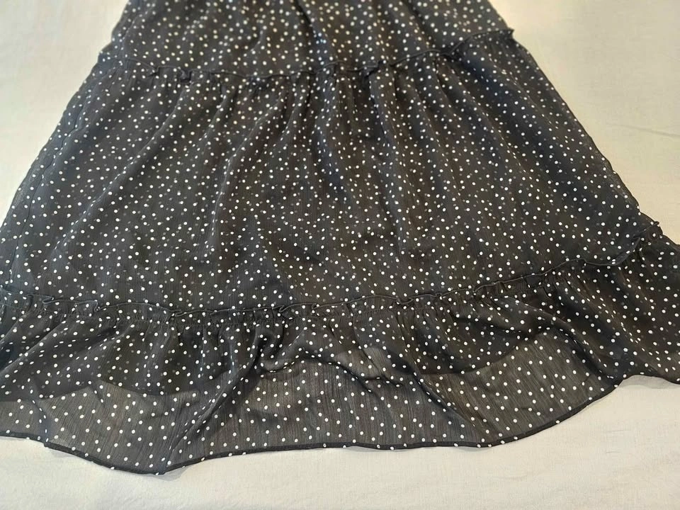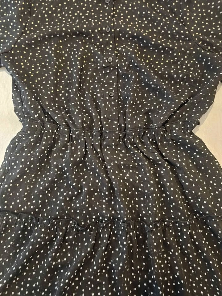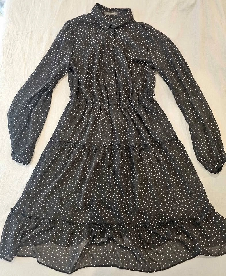 Cute Suzy Shier dress. Black with white polka dots. Long sleeve, button-front shirtdress style. Has elastic waist and tiered skirt. Fabric is sheer and flowy. Great for casual or dressing up.