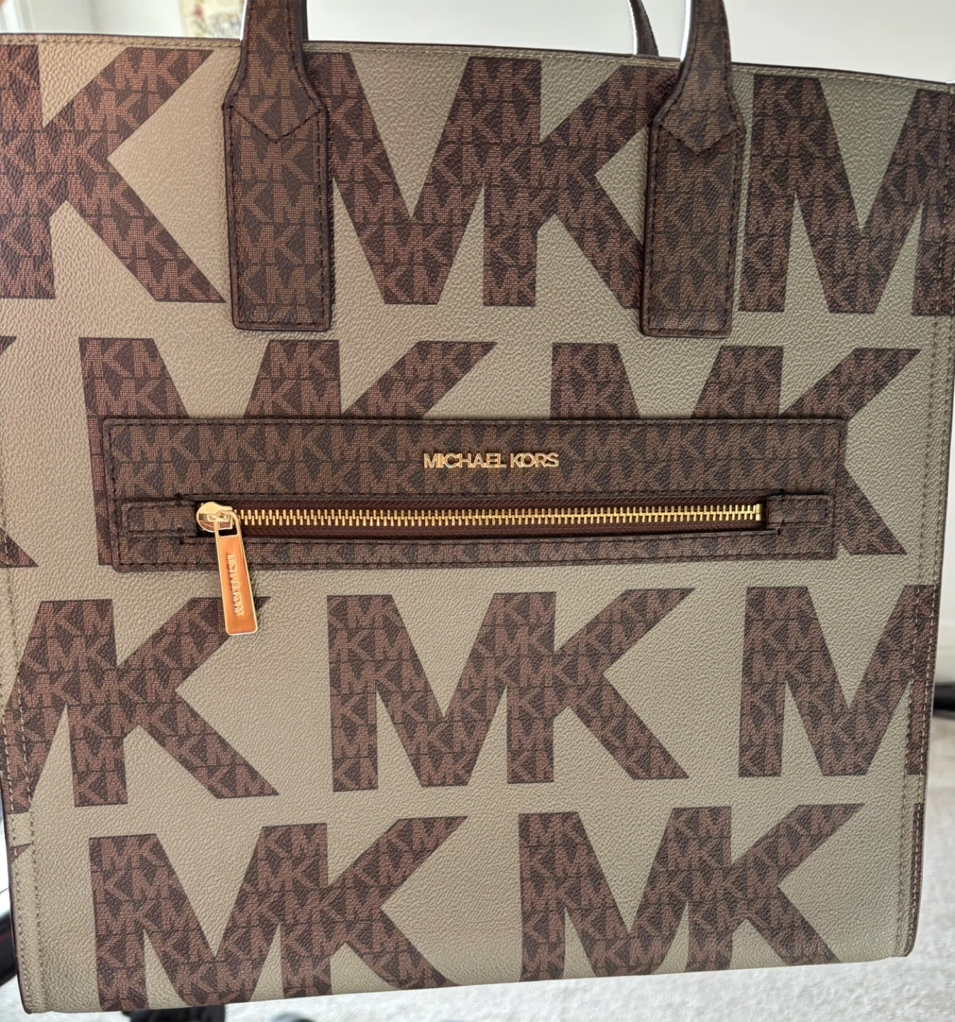 Stylish Michael Kors tote bag featuring the iconic MK logo pattern. It's in great condition and has a convenient zippered pocket on the front. Perfect for everyday use. Worn for an hour only. Brown is so much inn now