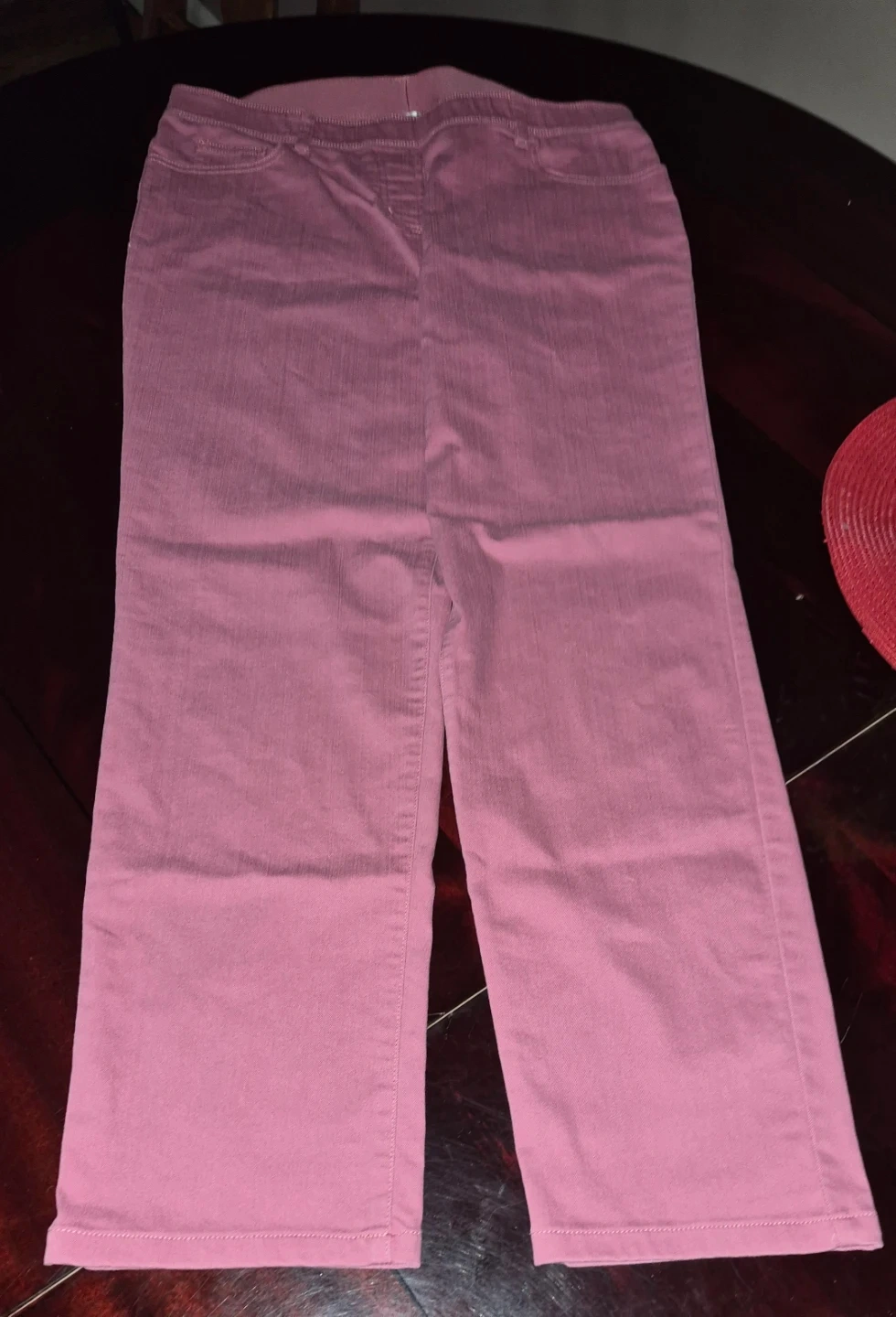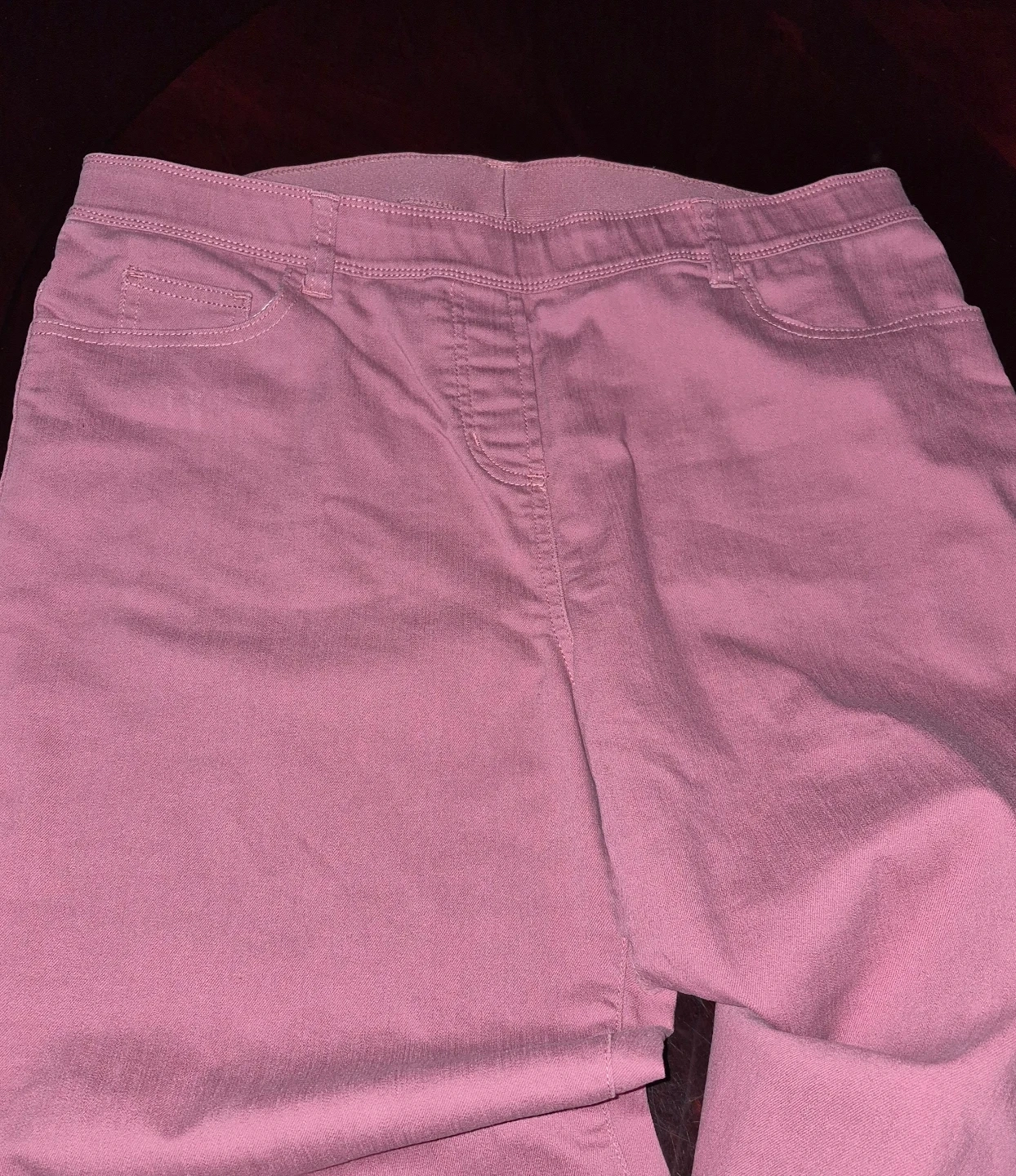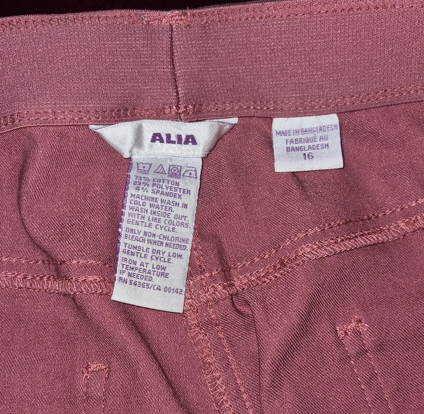 These ALIA women's pants are a lovely shade of pink. They're made from a comfortable blend of 73% cotton, 25% polyester, and 2% spandex. These would be great for casual wear or dressing up!