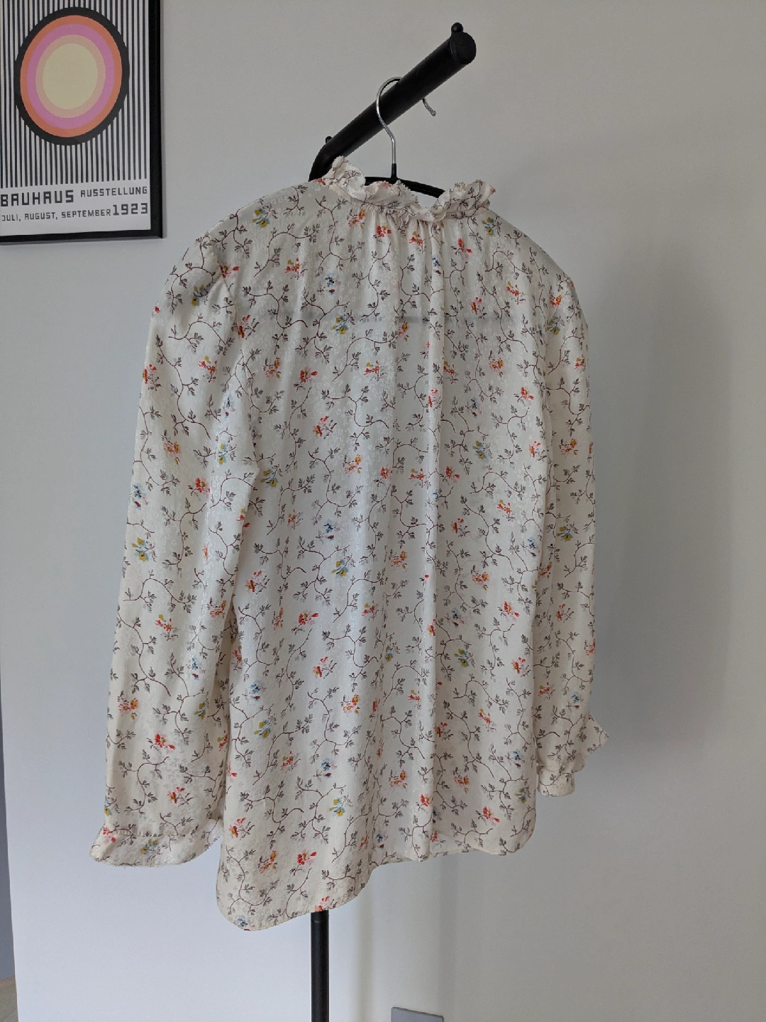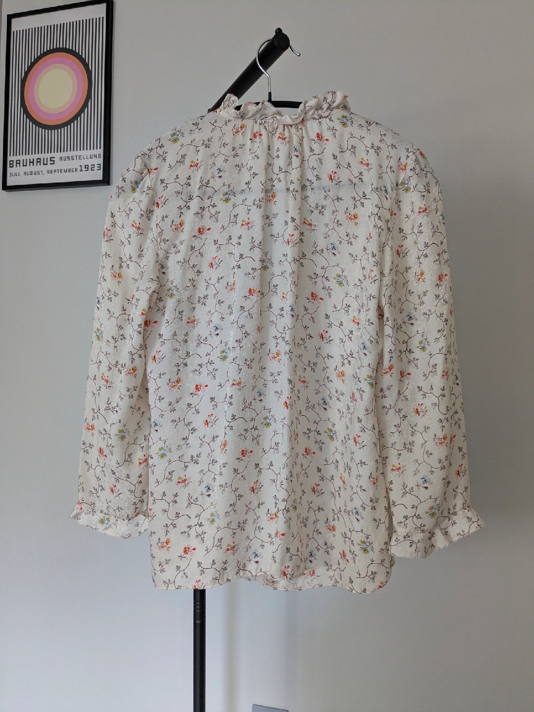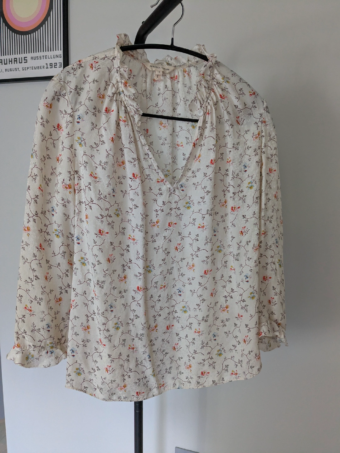 Rebecca Taylor silk blouse. It features a ruffled neckline and long sleeves. Perfect for adding a touch of elegance to your wardrobe and with jeans.
