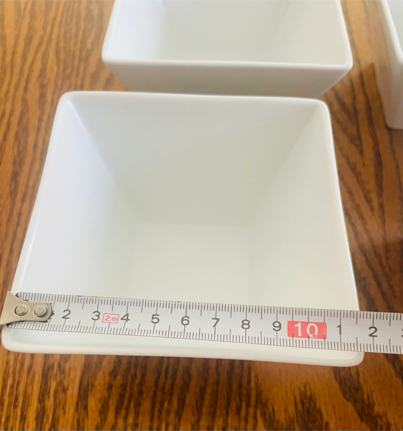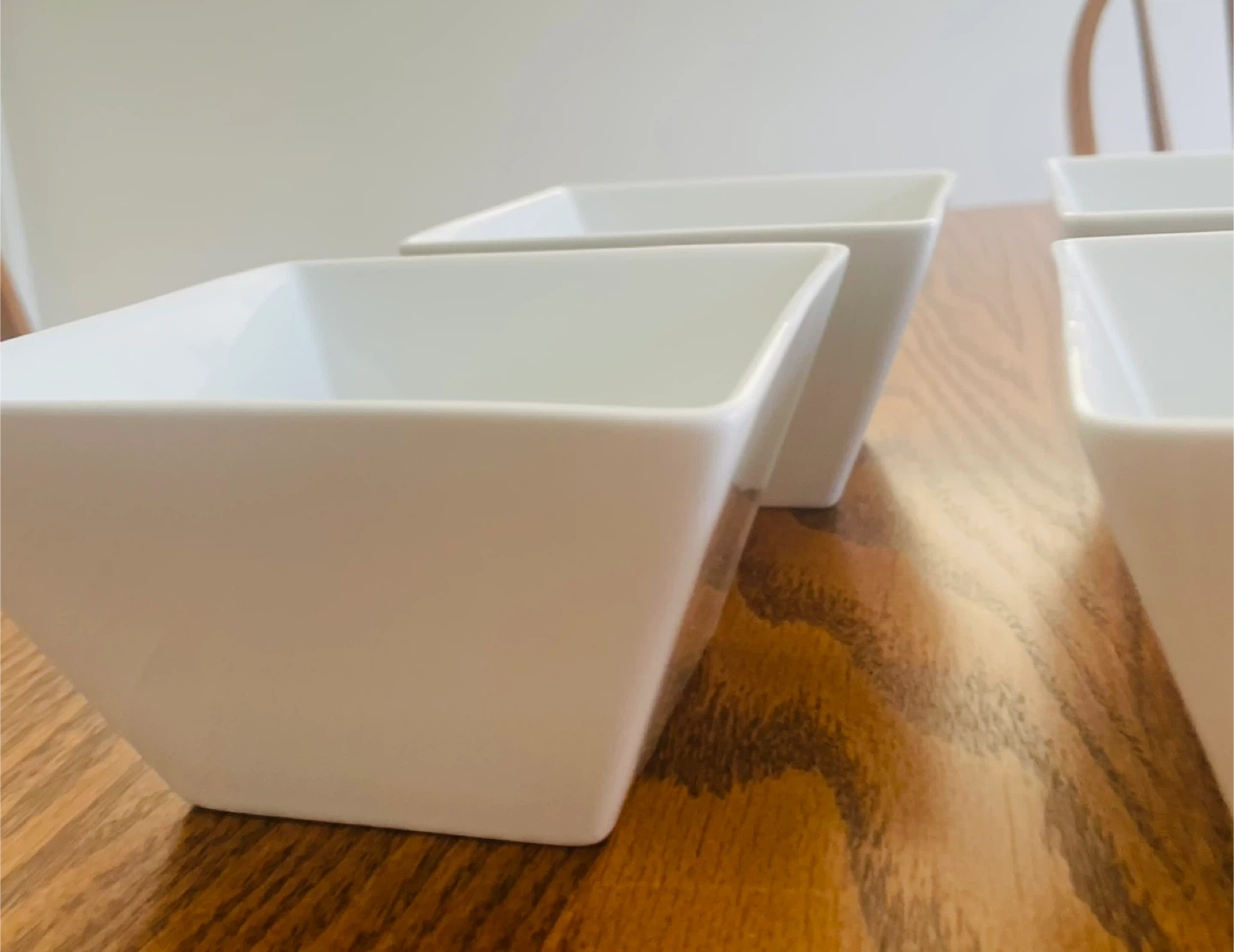Set of six white square ceramic bowls. Each bowl measures approximately 12cm across the top and 7cm in height. They're perfect for snacks, dips, or individual desserts. Ceramic material.