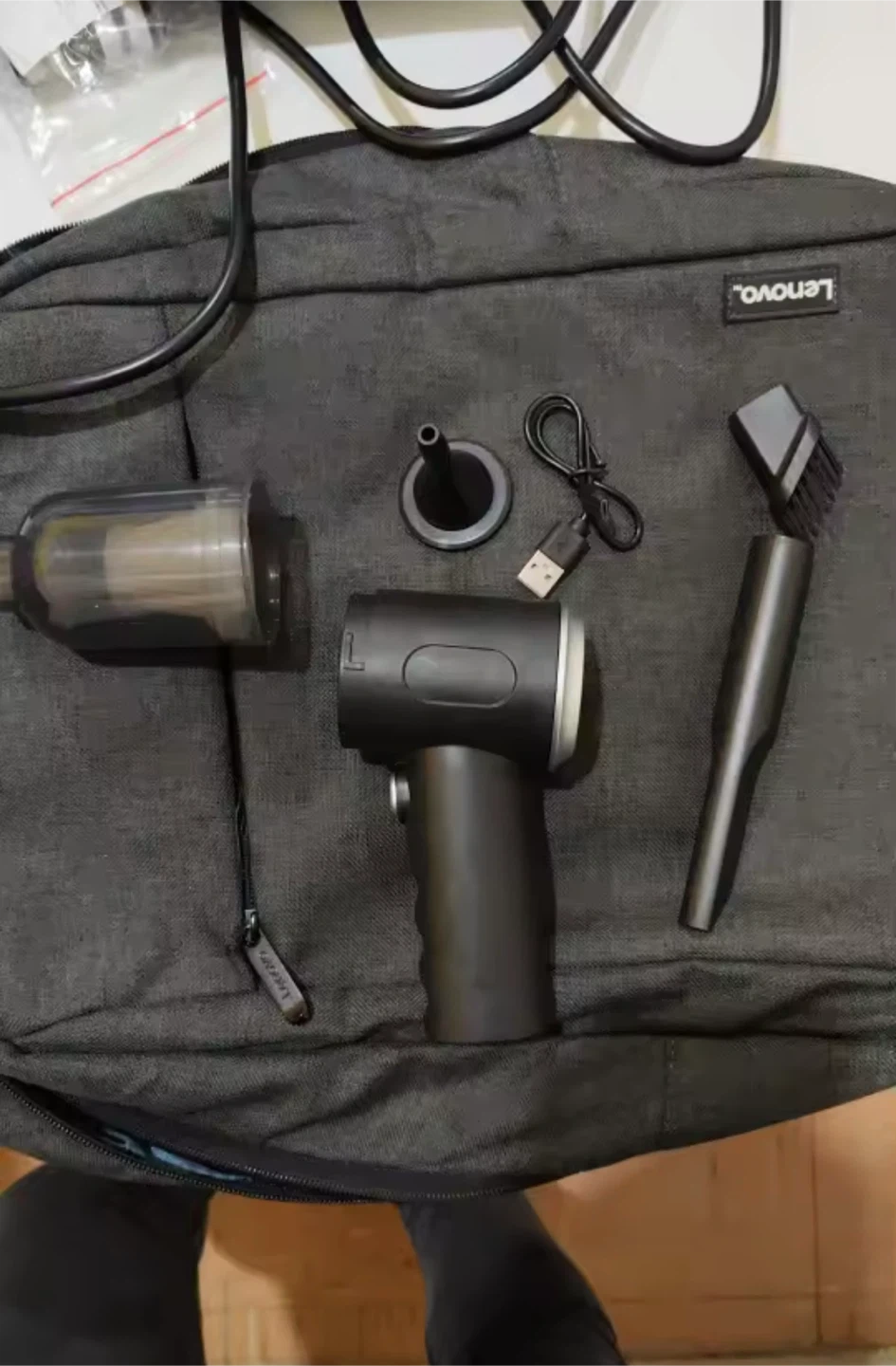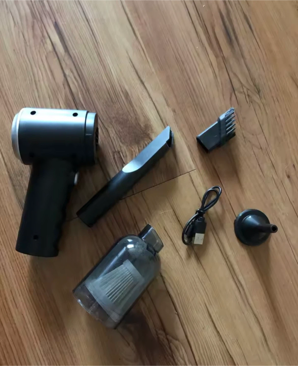 This is a 3-in-1 portable mini vacuum cleaner. It's designed for home and car use. Comes with multiple attachments and a USB charging cable.