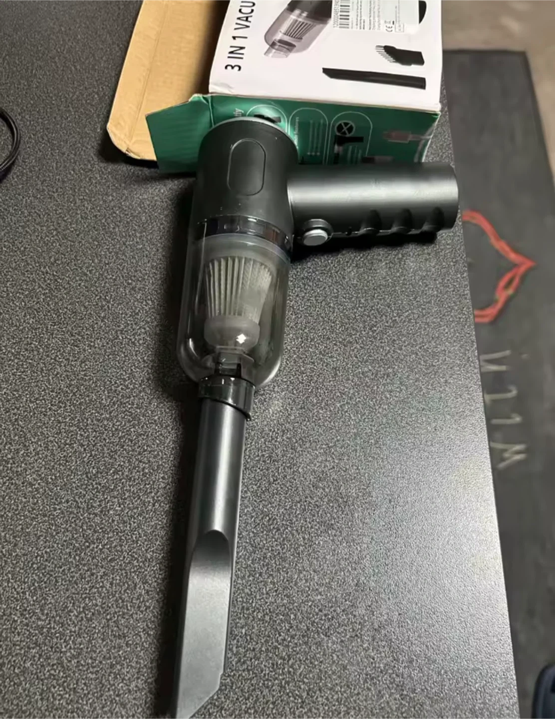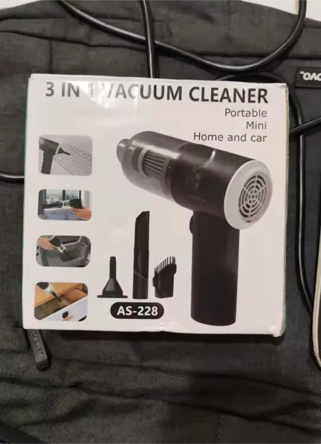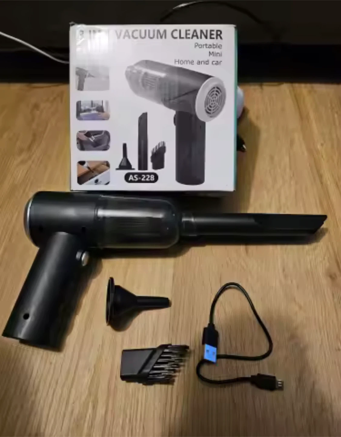 This is a 3-in-1 portable mini vacuum cleaner. It's designed for home and car use. Comes with multiple attachments and a USB charging cable.