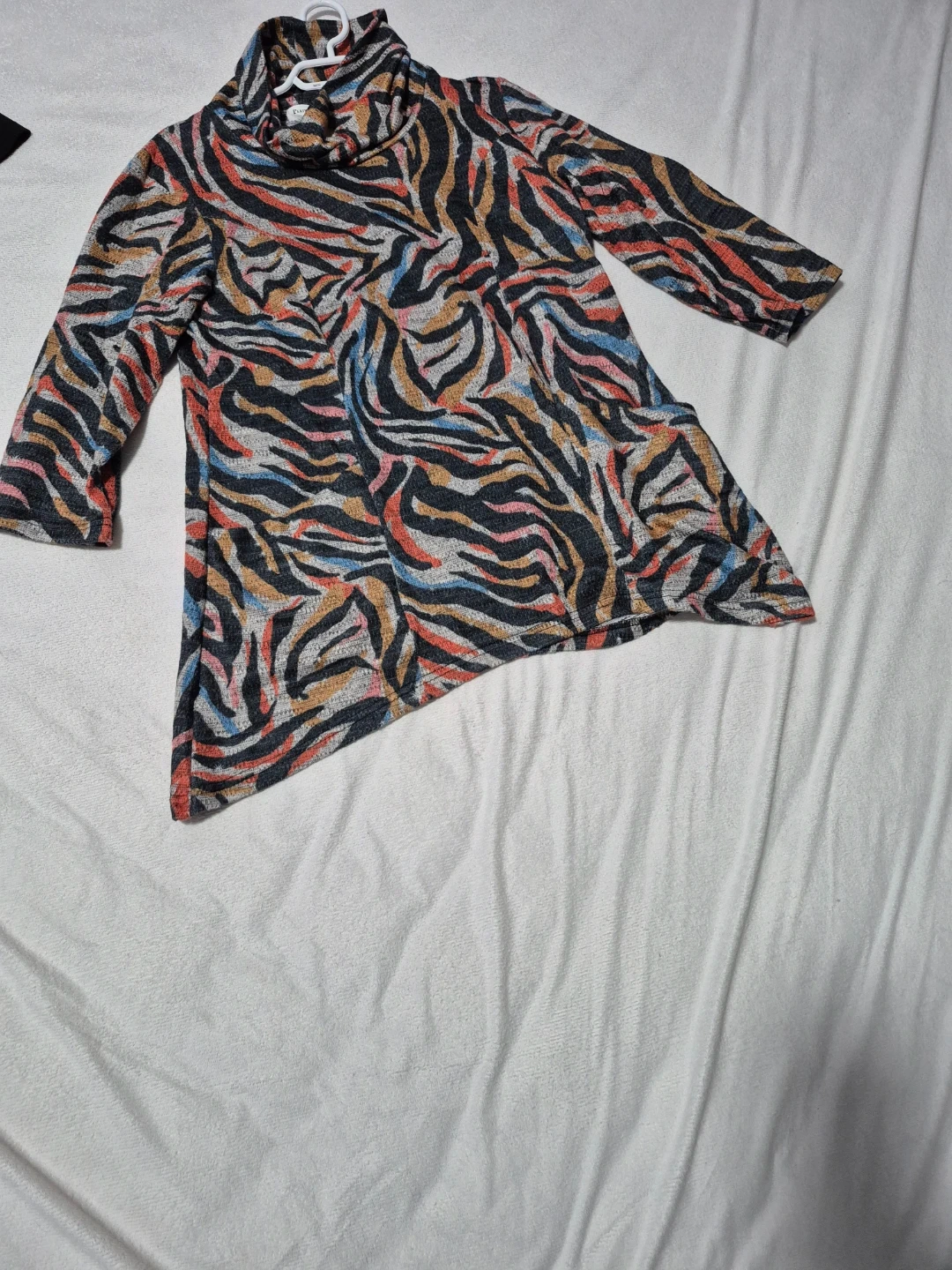 Here's a fun patterned tunic dress! It has a unique animal print design with a cozy turtleneck. The long sleeves make it perfect for cooler weather. It's in great condition and ready for a new home!