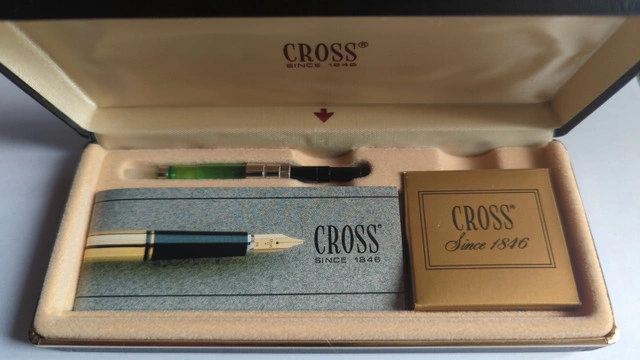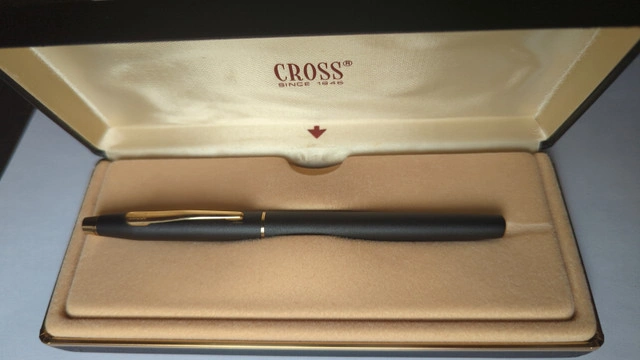 Cross 2506-M matte black fountain pen with a medium gold plated nib. Comes with box, converter, and cartridges (though they have dried out). This model was discontinued and replaced by the Cross Century (they look very similar). Pick up only. I can meet at Spadina, Bathurst, or Dupont stations (or somewhere nearby).