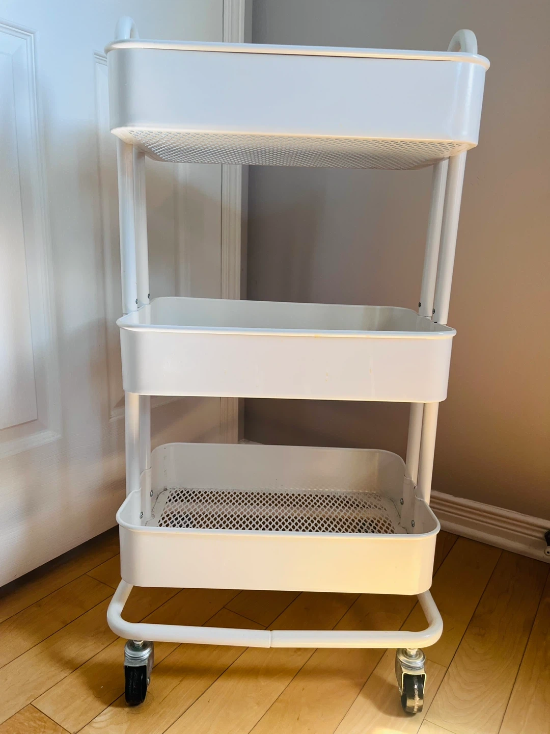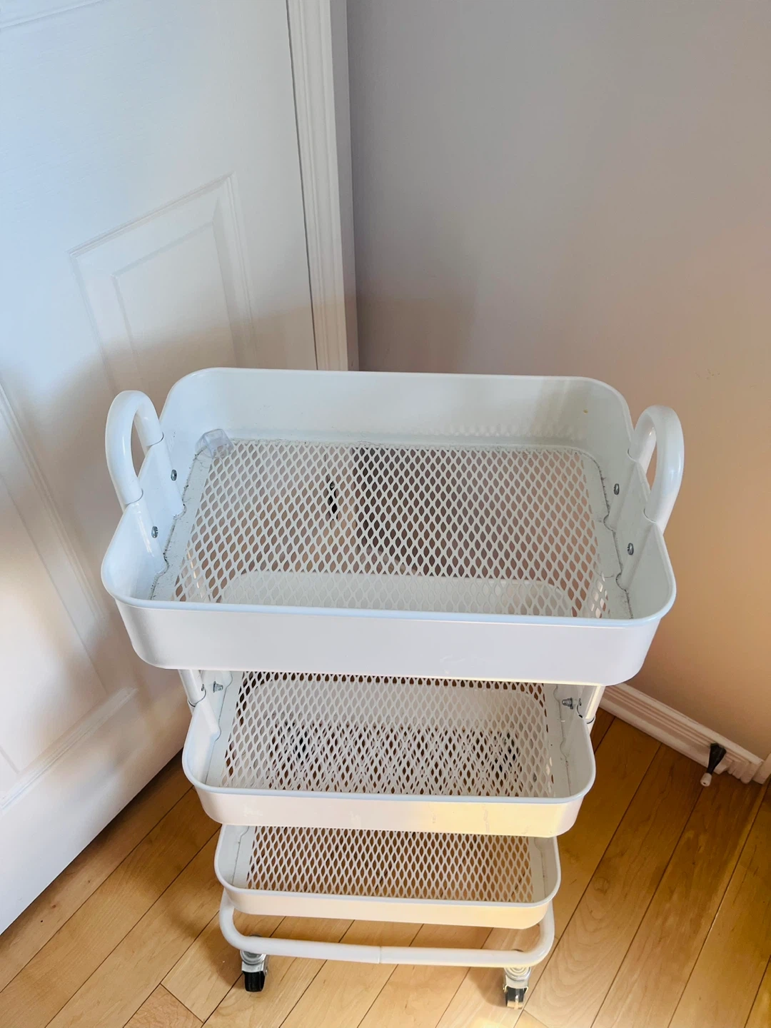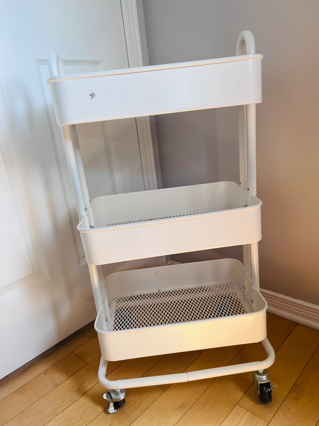 This white 3-tier rolling storage cart offers versatile organization. It features a metal construction with mesh-lined shelves and four wheels for easy mobility. Perfect for kitchens, bathrooms, or craft rooms!