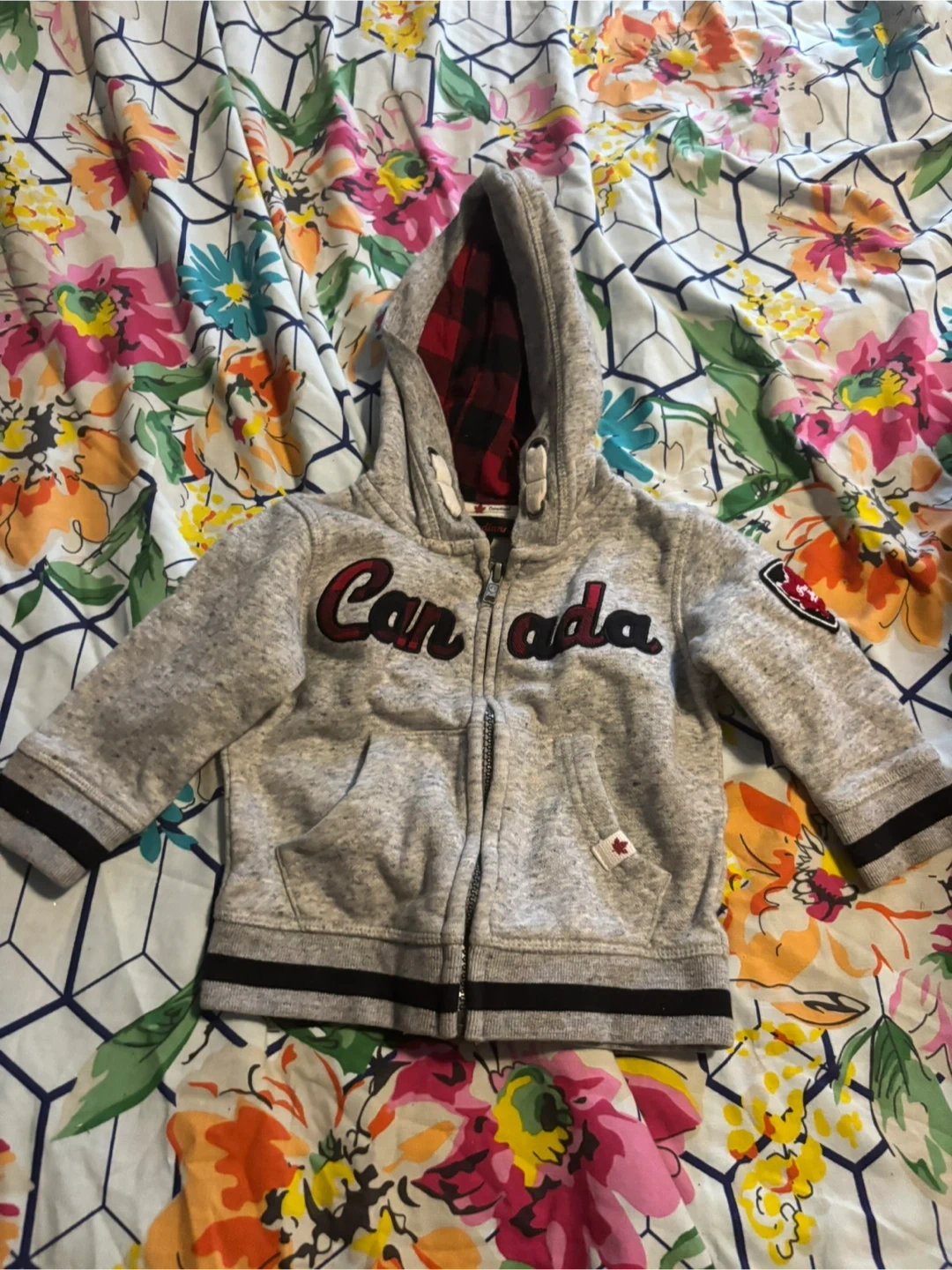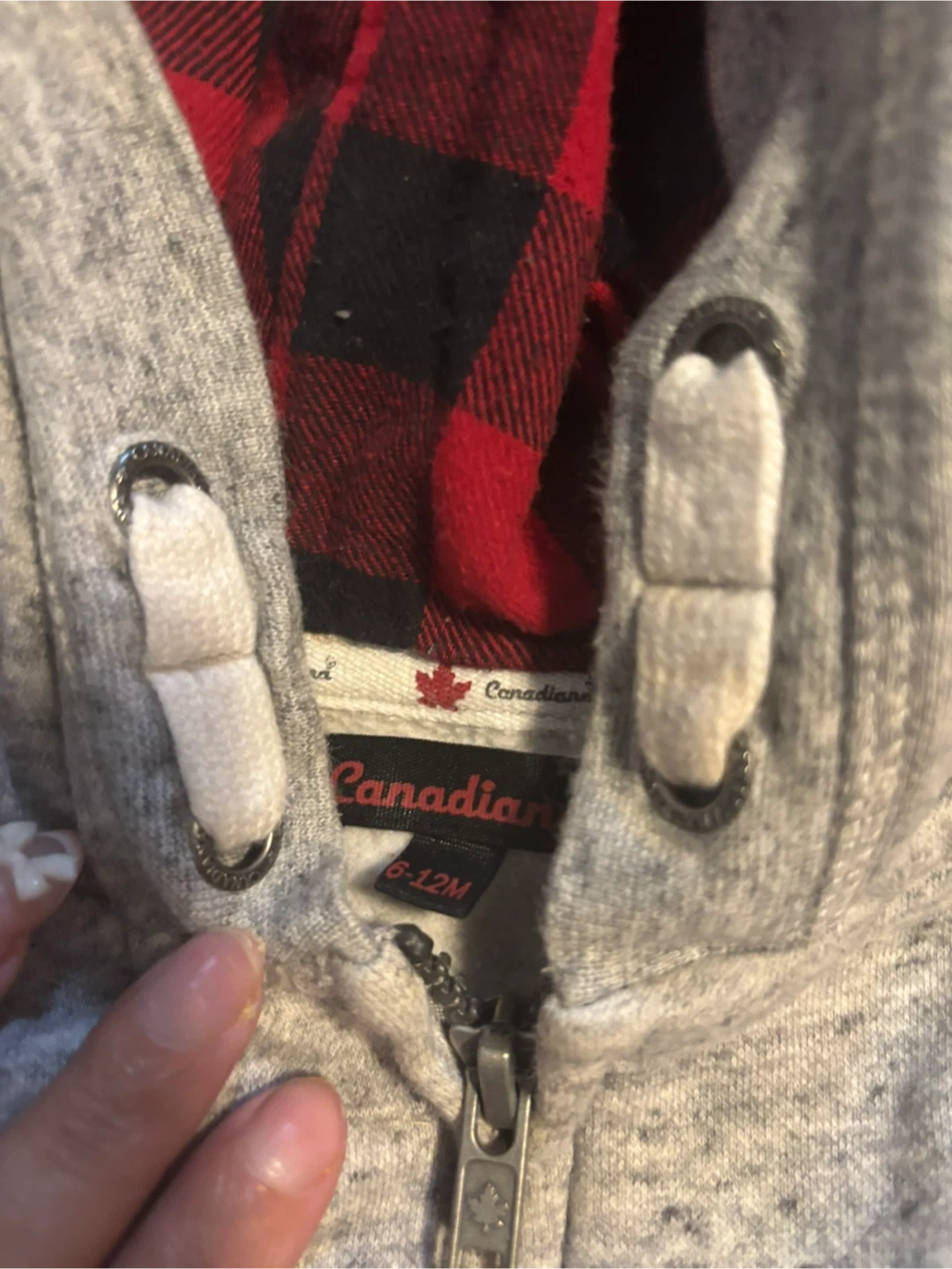 Super cute zip-up hoodie from Canadian! It's grey with a red and black plaid lining in the hood. The size is 6-12M.