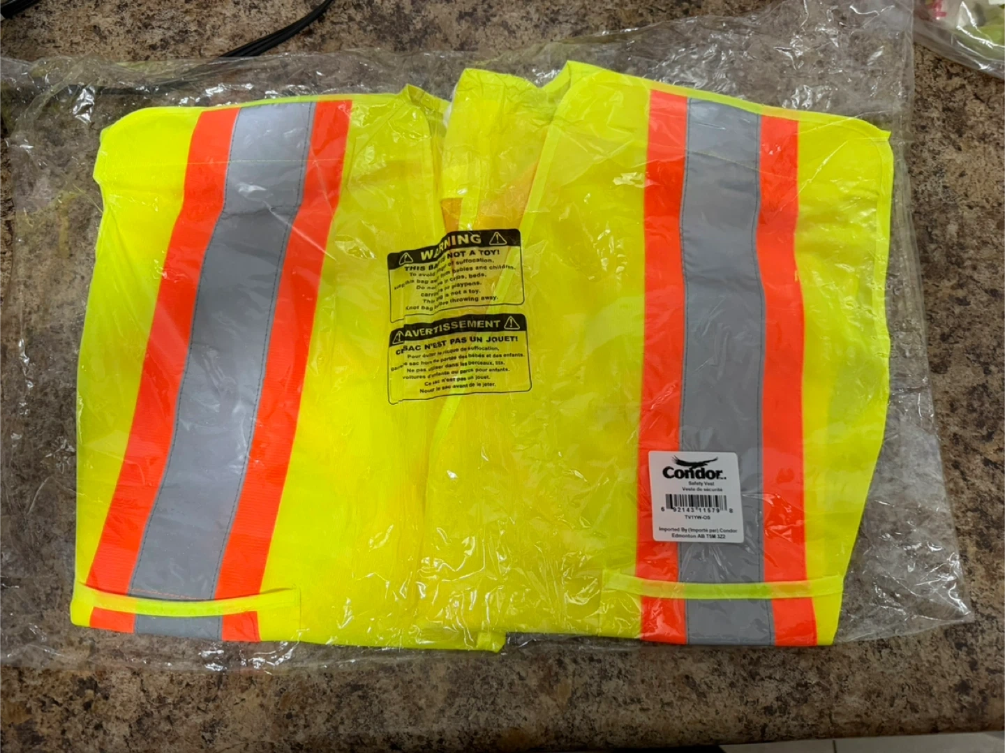 I'm selling a brand new Condor safety vest. It's bright yellow with reflective stripes, perfect for staying visible. Still in its original packaging!