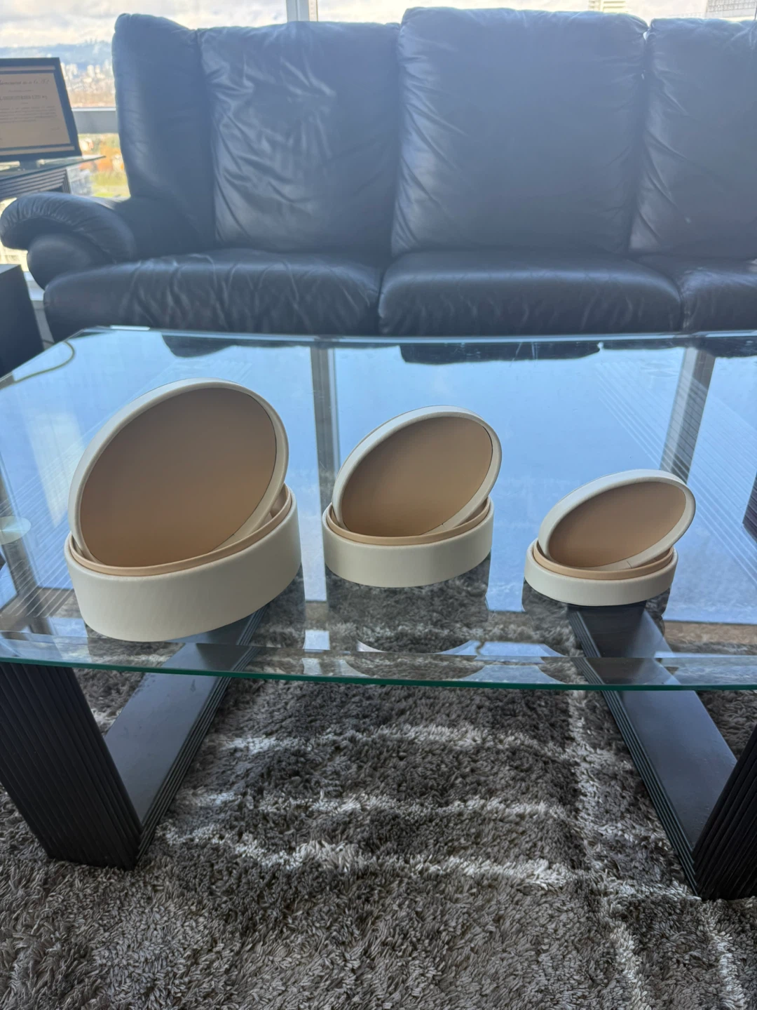 Brand new, never been used set of Danier leather boxes. These are made of genuine leather and come in a set of three different sizes. Perfect for organizing small items in your home or your jewelry! Included photo with Truly tall can for size reference against biggest box.