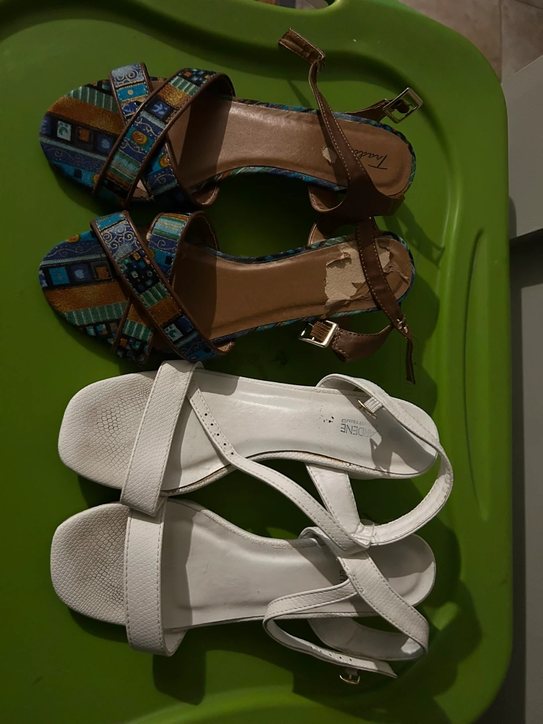 Two pairs of women's sandals included. Size 7. One pair features a colourful, patterned fabric with brown straps. The other pair is white with a textured finish. Both have ankle straps with buckle closures.