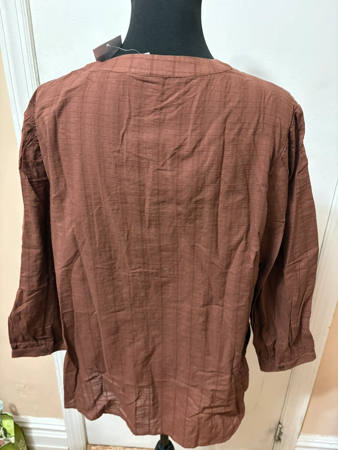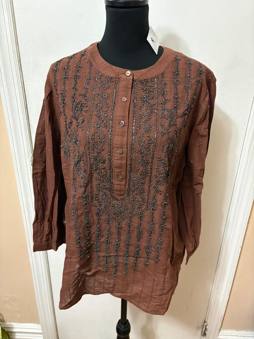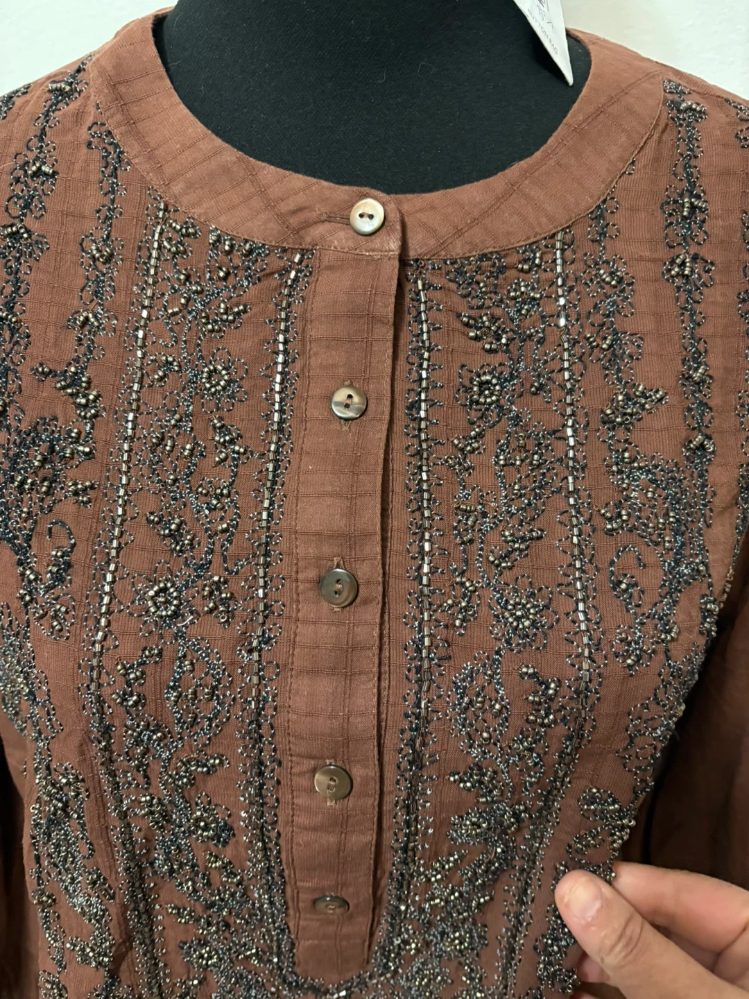 Brown tunic shirt with intricate bead and thread embroidery on the chest. It features a button-up front with three buttons and three-quarter length sleeves. Cotton material.
