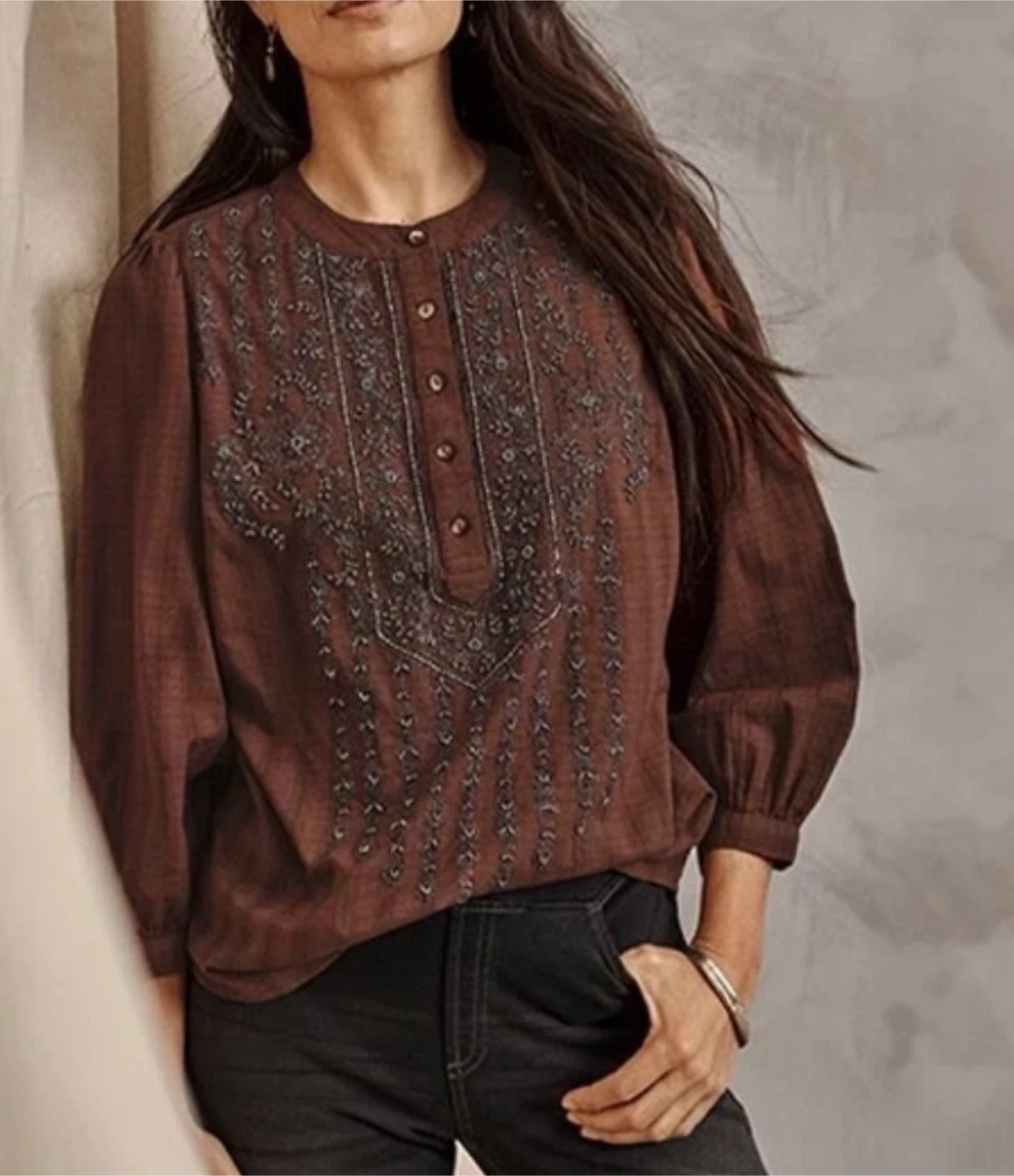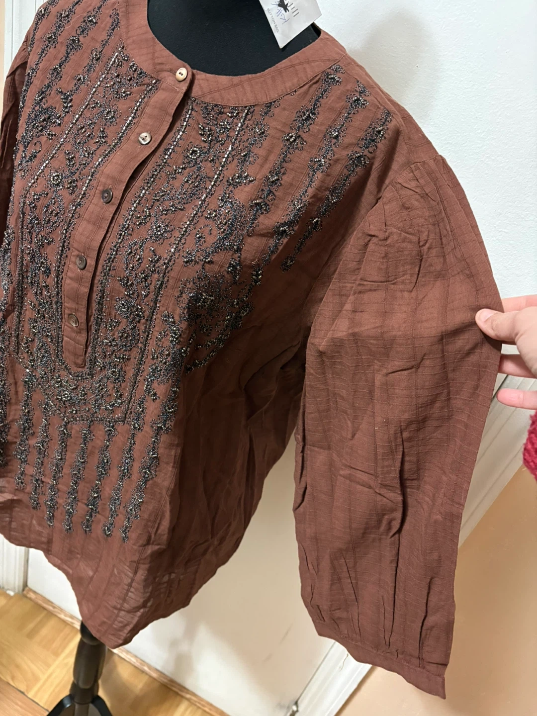 Brown tunic shirt with intricate bead and thread embroidery on the chest. It features a button-up front with three buttons and three-quarter length sleeves. Cotton material.