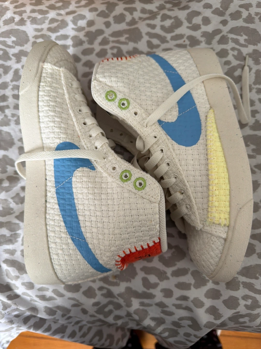 These are a pair of Nike Blazer Mid '77 shoes with a woven texture. They feature a blue swoosh on one side and a yellow accent on the other, with colorful stitching details. These shoes are in good condition and ready for a new owner!
