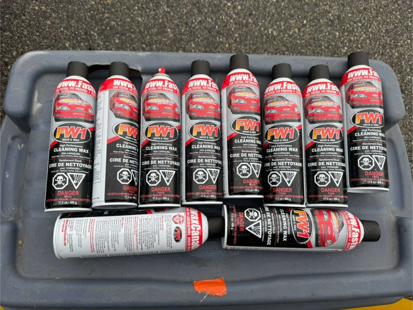 This is a 10- pack of FW1 High Performance Cleaning Wax cans. It's a wash and wax formula with carnauba. Each can contains 17.5 oz / 496 g. It's safe for paint, chrome, glass, and plastic. $25 each or all for $200. Located in Penticton