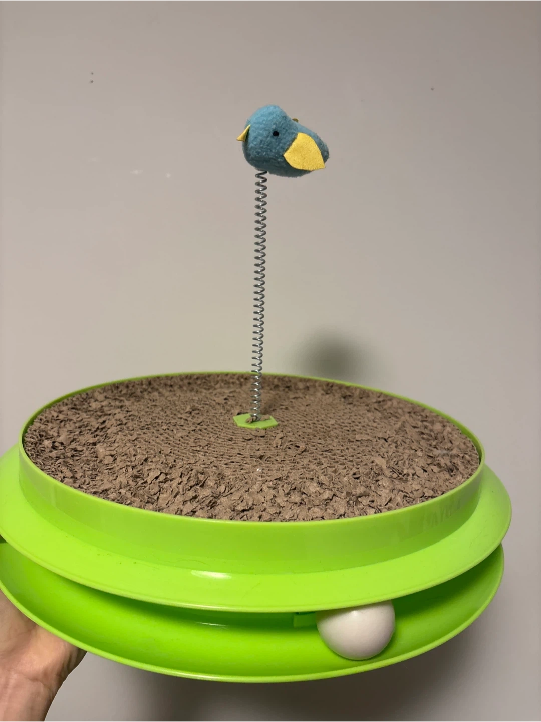 This fun cat scratcher features a textured surface for scratching. It has a blue bird toy on a spring that bounces and wiggles. A white ball rolls around the base. It's great for keeping your feline friend entertained!