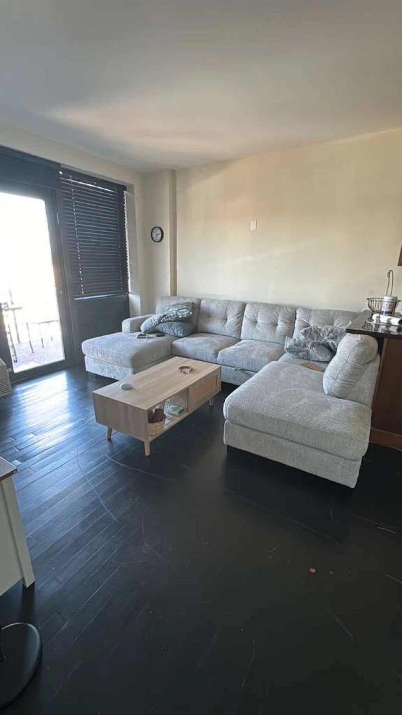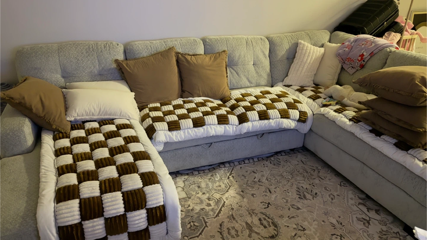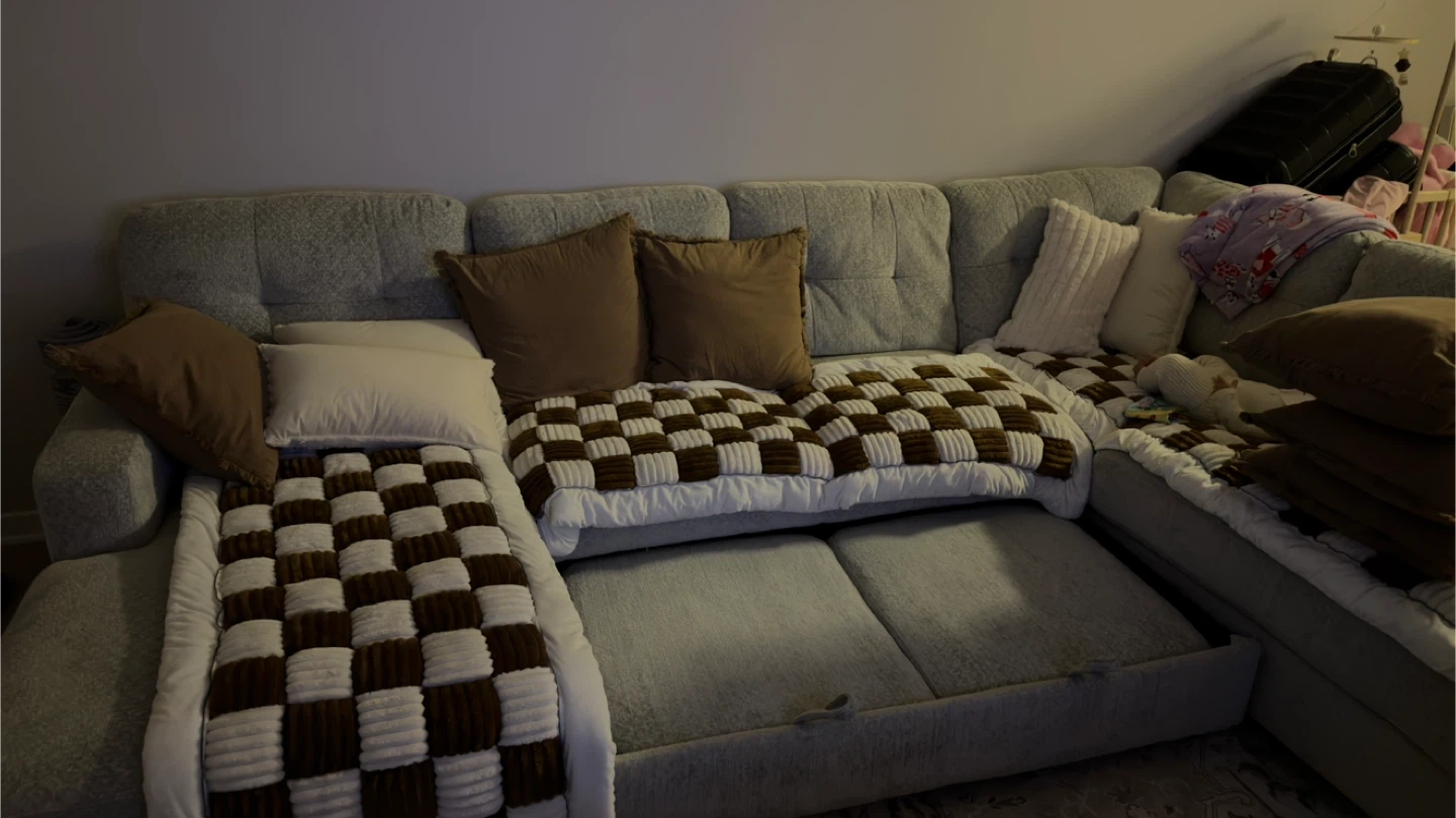 This sectional sofa features a pop-up sleeper function. Upholstered in a light gray textured fabric. It's designed with tufted back cushions and includes accent pillows.
