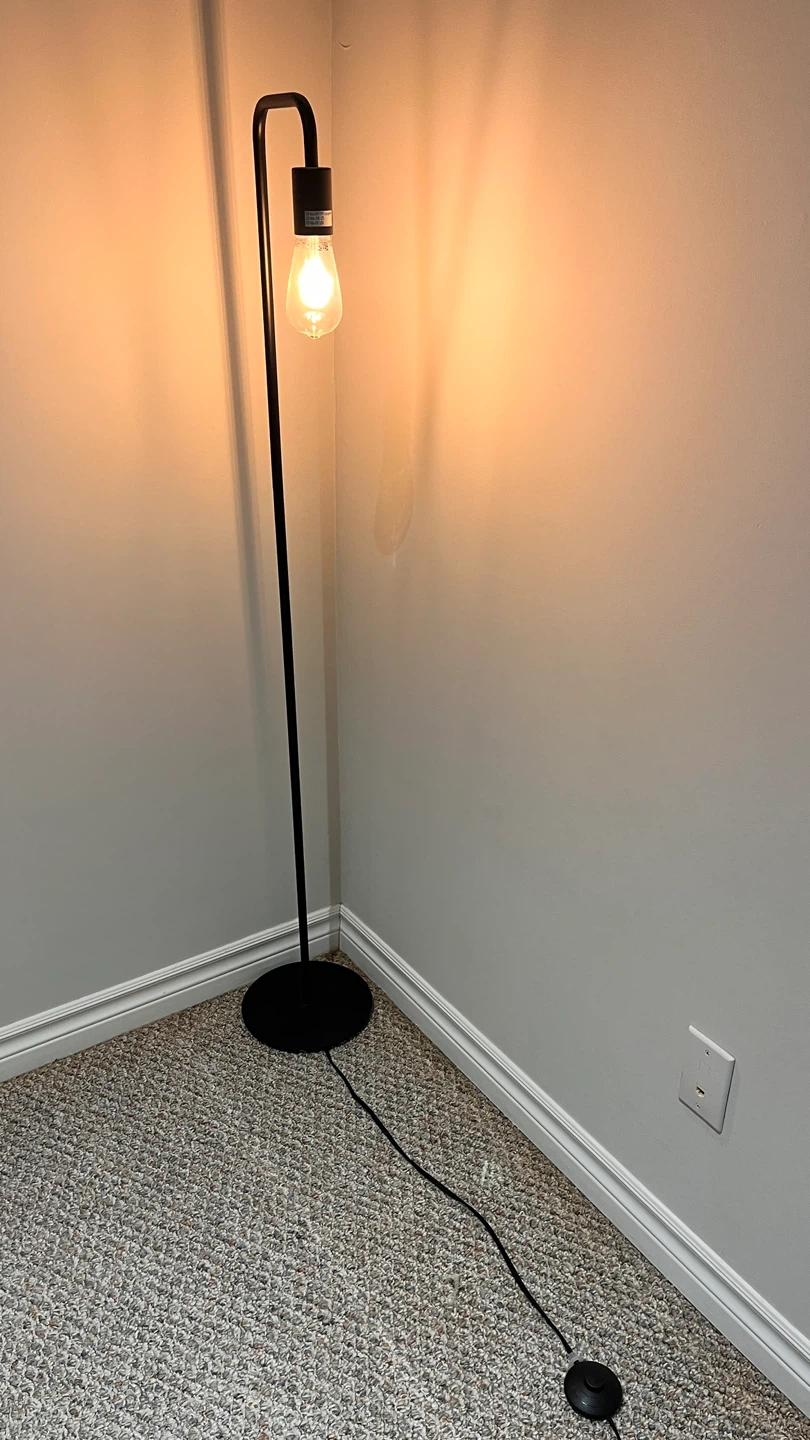 This is a black metal floor lamp with a simple design. It comes with a foot switch for easy operation. Its sleek profile makes it a great addition to any room.