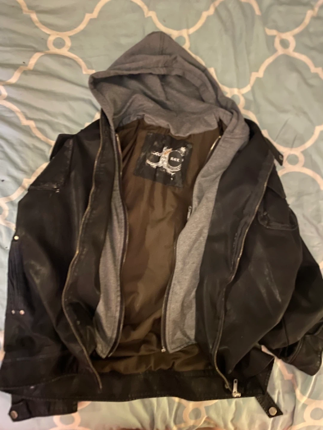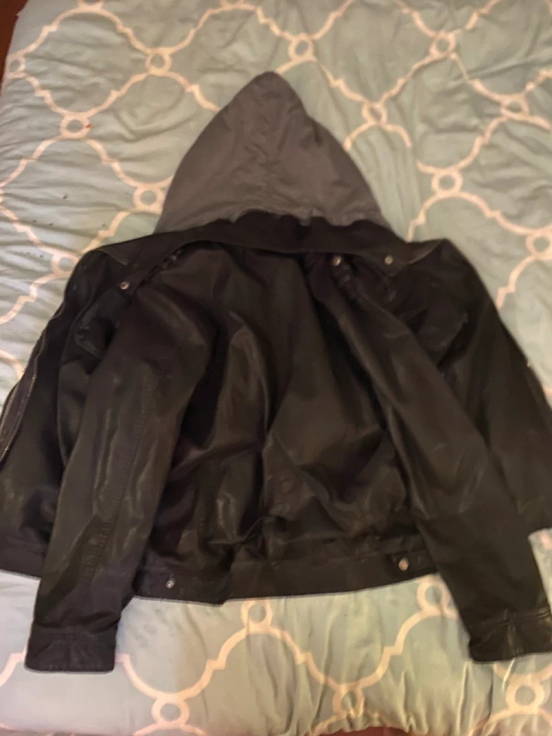 This black faux leather jacket features a grey removable hoodie for a layered look. It has a zip-up front closure and is perfect for cooler weather. It offers a stylish and practical option for any wardrobe.