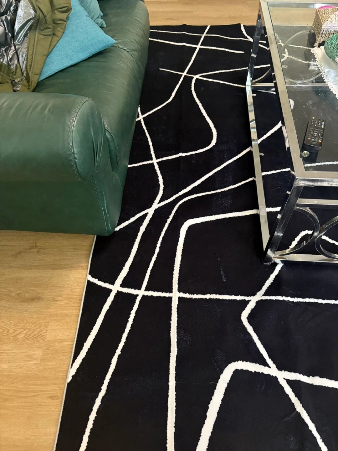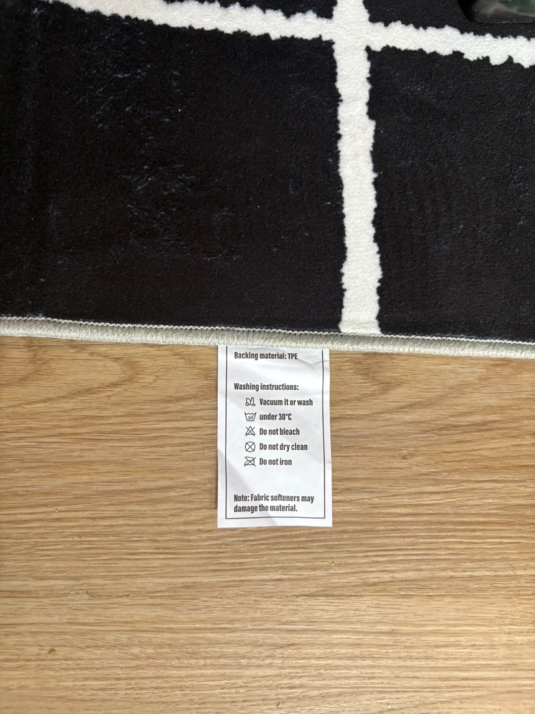 This black rug features a modern abstract line design in white. It's made with a TPE backing material for durability. Vacuum it or wash under 30°C for easy care. Moving sale.