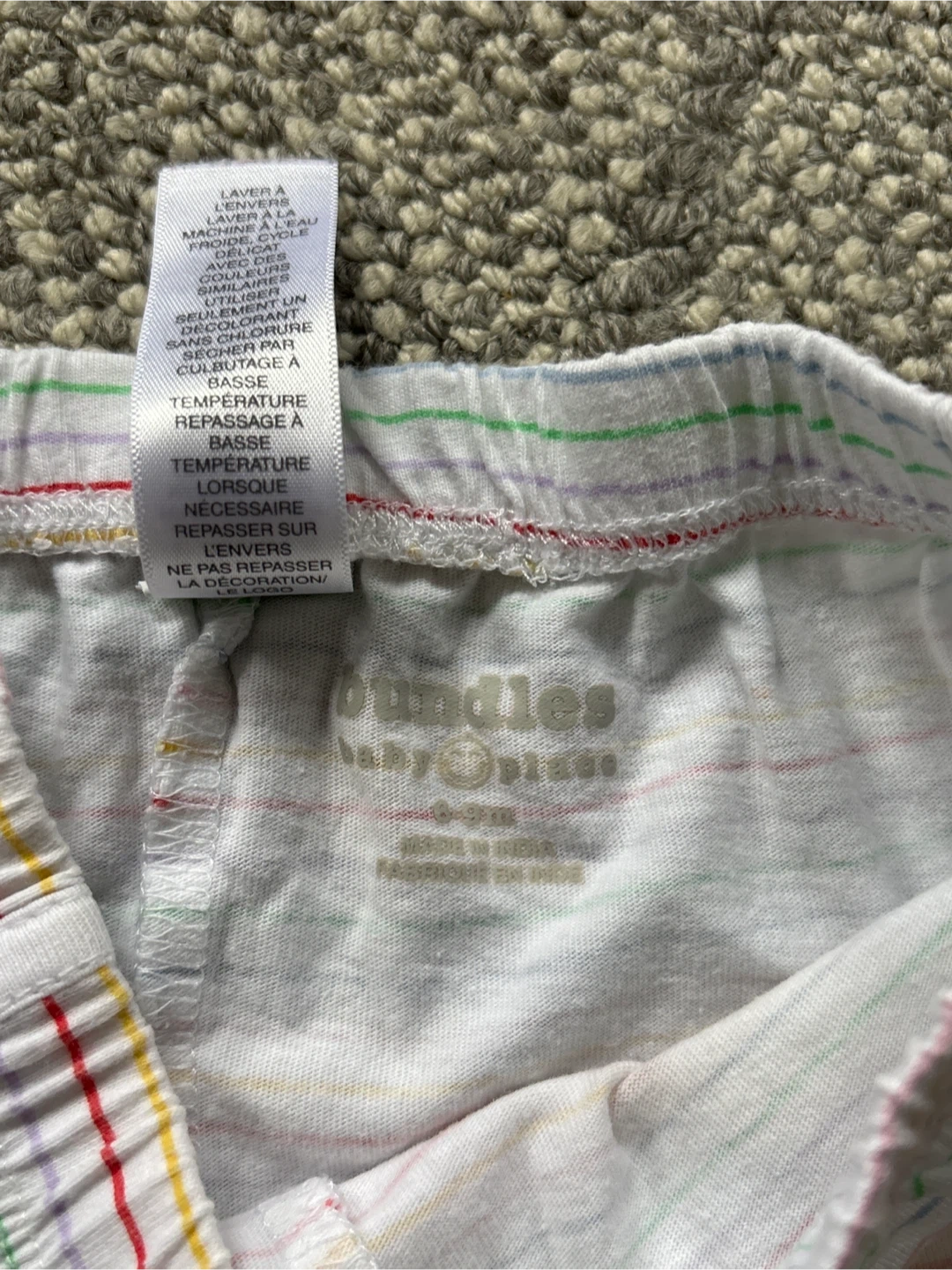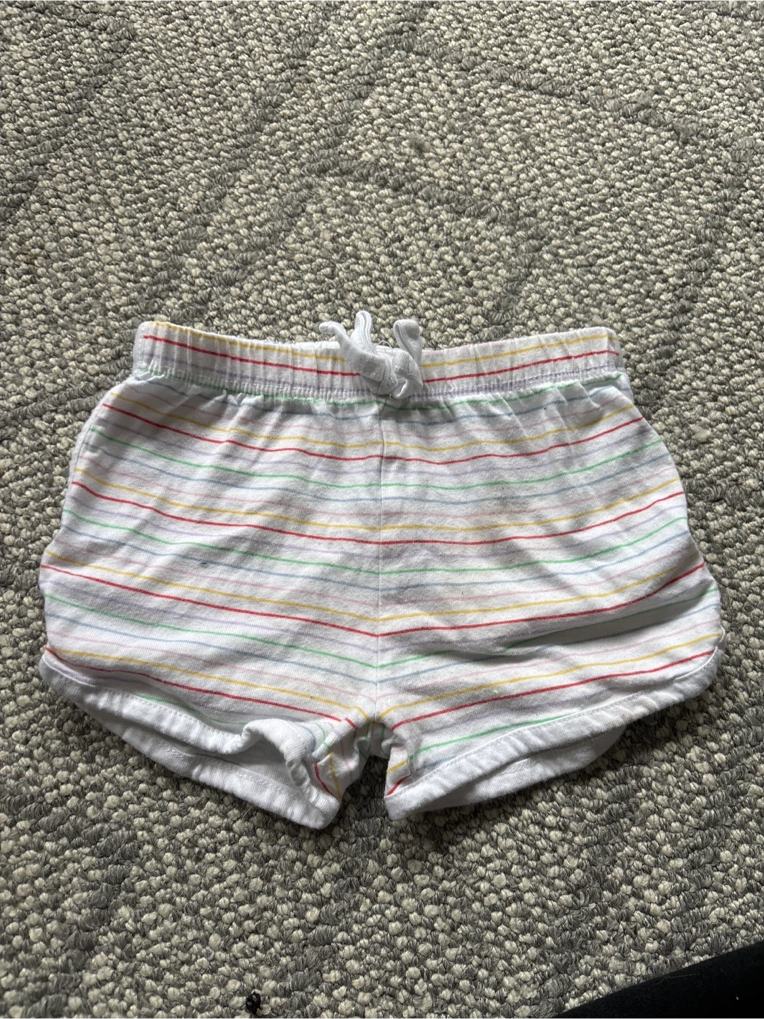 Bundles Baby Place infant shorts with rainbow stripes. Elastic waistband with drawstring. Cotton blend material. 6-9M