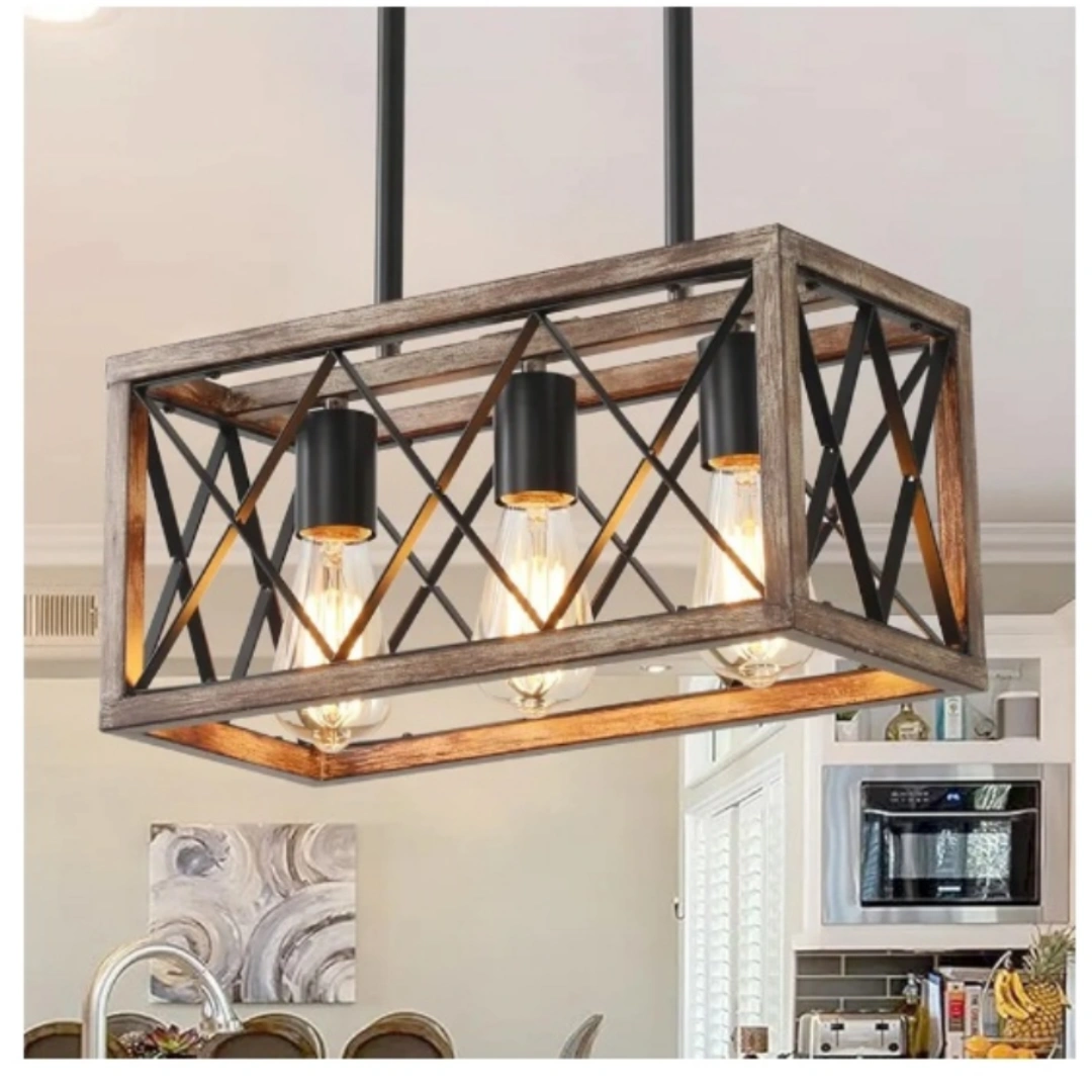 Three-light island pendant. Features a distressed wood frame and black metal accents. Great for kitchens or dining rooms. Industrial style.